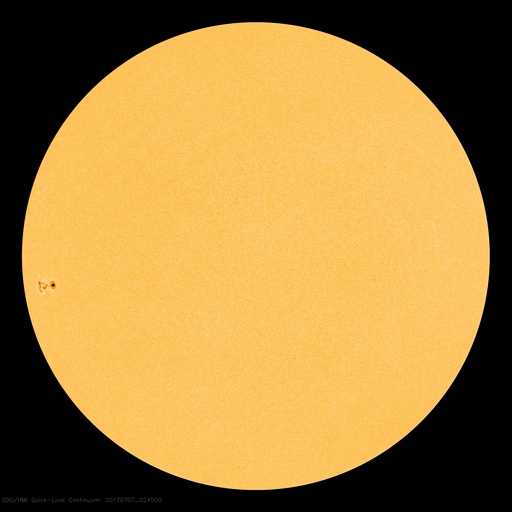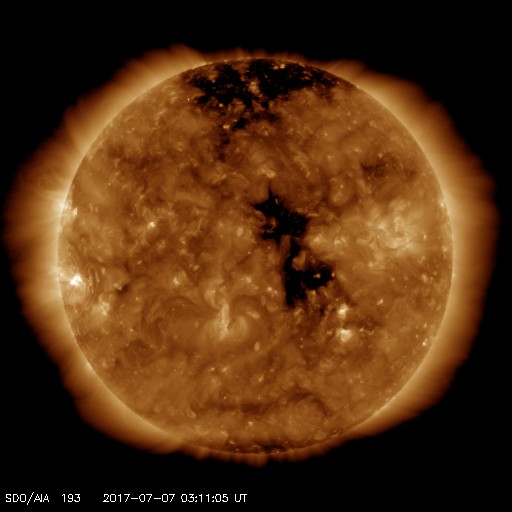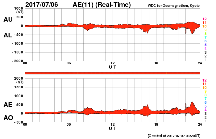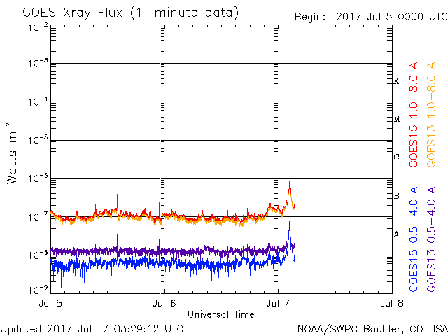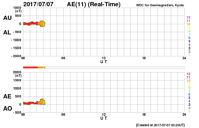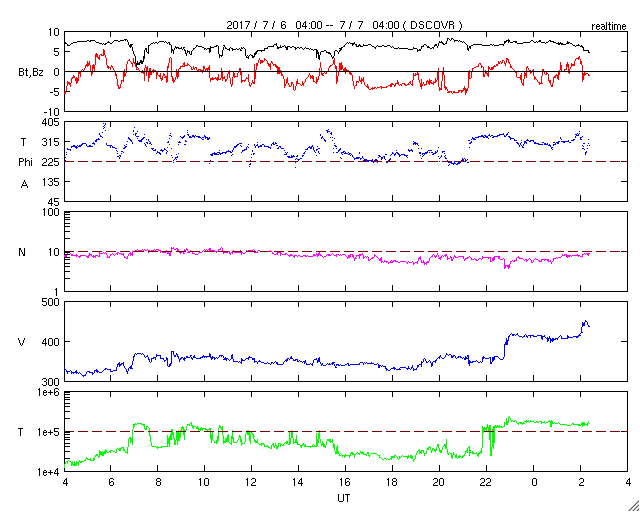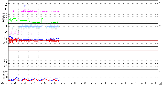 2017/ 7/ 7 12:29 更新 太陽風はやや高速になっています。太陽の東に2665黒点群が見えています。 担当 篠原 太陽風は、今朝までは350km/秒と低速の状態が続き、 その後、400km/秒と平均的な速度に上がりました。 そして、現在は450km/秒とやや高速になりかけています。 このまま少し高まった状態が続くのか、すぐに戻ってしまうのか、 しばらく注目してください。 太陽風の磁場強度は、7nTと少し強まっていましたが、 速度が上がるのと反対に、5nTと平均的な値に戻っています。 太陽風磁場の南北成分は、 振れ幅は小さいですが、南北両方に変化しています。 このため、磁気圏の活動はやや高まっていて、 AE指数は、300〜600nTの小中規模の変化が、 度々発生しています。 SDO衛星AIA193では、 太陽中央部のコロナホールが少し西に進んでいます。 この領域の影響が、明日か明後日くらいに到来しそうです。 太陽は、東端の2665黒点群の全体が見えるようになっています。 X線グラフの最後に、 もう少しでCクラスに届くフレアが発生しています。 今後、活動が高まるかどうか注目してください。