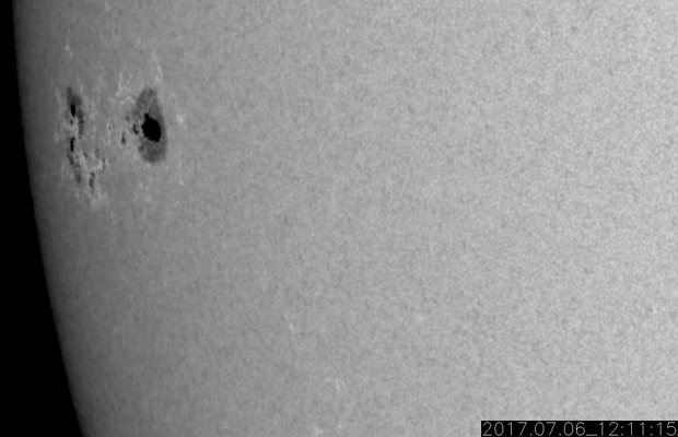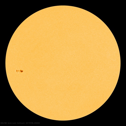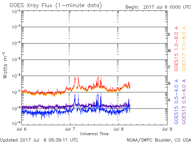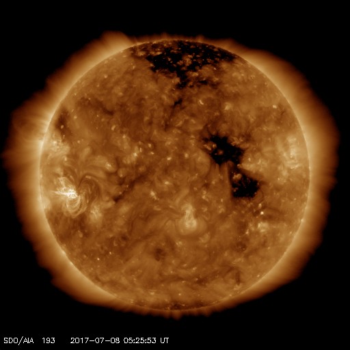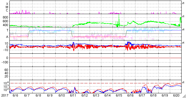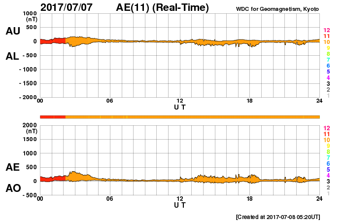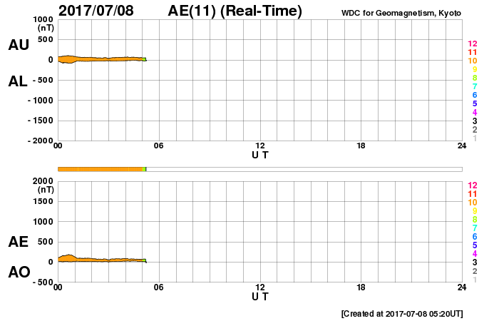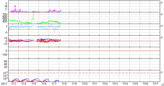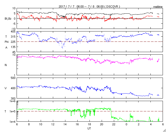 2017/ 7/ 8 14:39 更新 太陽風は低速になり、磁気圏も穏やかです。 担当 篠原 2665黒点群では、昨日のニュース以降も小さい活動が続き、 昨夜、7日22時半(世界時7日13時半)には、 C1.0に達する小規模フレアが発生しました。 しかし、その後は変化が少なくなり、 2665群は落ち着きつつあるようです。 この1日半の間の2665黒点群の変化を、 SDO衛星可視光写真の動画で紹介します。 大きく複雑な姿が目立っています。 太陽風の速度は、昨日の午後には400km/秒へ下がり、 今朝に入ると更に低下して、330km/秒と低速の風に変わっています。 磁場強度も、5nT付近で安定しています。 コロナホールによる次の太陽風の乱れが近づいている可能性がありますが、 今のところ、太陽風のデータに変化は見られません。 太陽風磁場の南北成分は、0nT付近で小さく変化する程度です。 オーロラの活動度を示すAE指数も、小さい変化が見られる程度で、 磁気圏は穏やかな状態です。 ![]() 2665黒点群の変化。SDO衛星。 (c) SDO (NASA)、(動画加工 : 宇宙天気ニュース) ![]() 世界時7月7日のAE指数(速報値)。 (c) 京都大学WDC ![]() 世界時7月8日のAE指数(速報値)。 (c) 京都大学WDC ![]() SDO衛星のAIA193カメラによる太陽コロナの様子 (c) SDO (NASA) ![]() SDO衛星による太陽の可視光写真。マウスの矢印を写真に重ねると、黒点番号付きの写真に切り替わります。 (c) SDO (NASA) ![]() GOES衛星の太陽X線データ (c) NOAA/SWPC ![]() DSCOVRが観測した太陽風の磁場(1番上の枠、黒線は全体の強度、赤線は南北成分) および、太陽風の密度(3番目の紫線)、速度(4番目の青線) (c) データ:NOAA/SWPC、作図:宇宙天気ニュース ![]() 27日の太陽周期に合わせたデータプロット 太陽が同じ面を地球に向けていた27日前の変化から、今後を予想することができます。 (c) 作図:宇宙天気ニュース