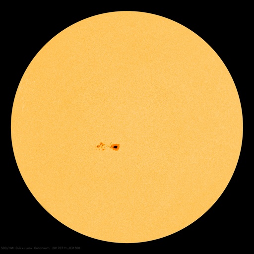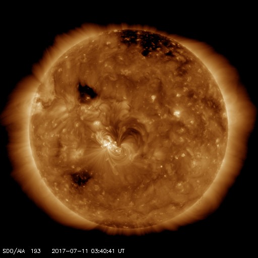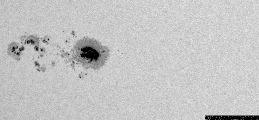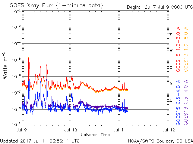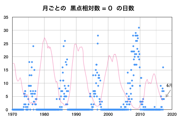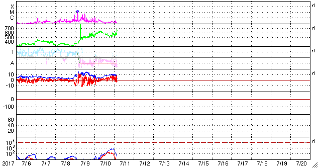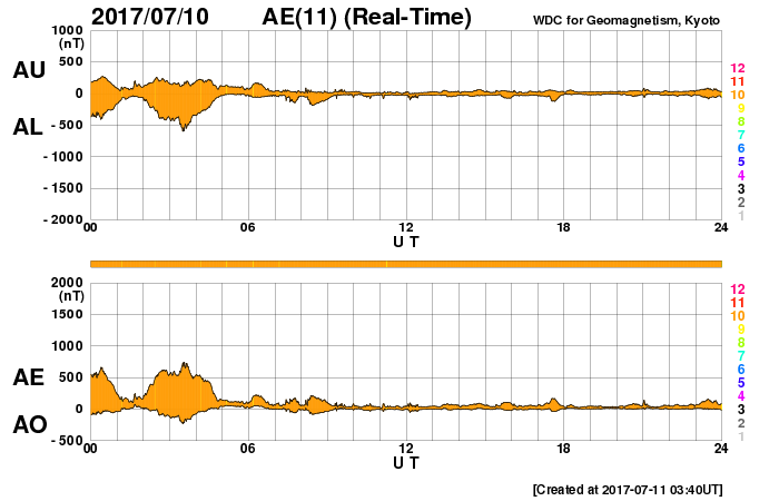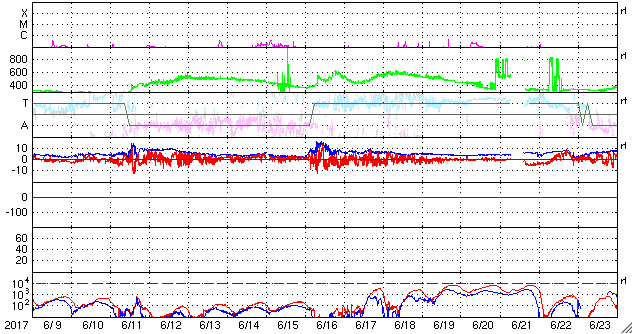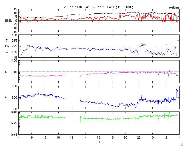 2017/ 7/11 12:56 更新 高速の太陽風が続いています。6月の黒点相対数は、19.4 でした。 担当 篠原 紹介が遅くなりましたが、 WDC-SILSOによる6月の黒点相対数は、19.4 でした。 5月が 18.8 だったので、ほとんど同じ値です。 長期変化のグラフで見ると、小さい変動の範囲内にあって、 太陽活動は、極小に向かって低下が続いています。 無黒点の日数は、4日でした。 こちらも増減しながらですが、5日前後を推移しています。 こちらのグラフも、10日前後で変化するように次第に増えていくでしょう。 2665黒点群は、昨日のニュース以降は静かになり、 X線グラフは、変化が少なくなっています。 SDO衛星の拡大写真で、この1日間の2665群の推移を紹介します。 このまま静かになっていくのか、 しばらく休んで、再び活動度を高めるのか、 引き続き注目してください。 太陽風は、昨日のニュースの後、630km/秒くらいまで速度が高まりました。 その後、500km/秒近くまで下がりましたが、 今朝から再び高まり、現在は580km/秒まで戻っています。 と書いている所で、最新データは660km/秒へ急に速度が高まっています。 磁場強度も、5nTから10nTへ高まり、再び下がり始めたところで、 上記の速度の急増とともに、こちらは4nTへ急に下がっています。 細かい変化ですが、太陽風はいろいろと変化しています。 磁場の南北成分は、北寄りで推移しています。 このため、磁気圏の活動は穏やかになっていて、 AE指数は小さい変化に留まっています。