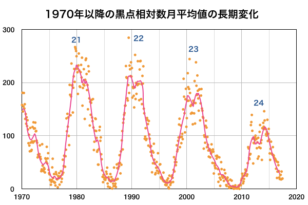 (c) 黒点データ:WDC-SILSO、作図:宇宙天気ニュース ![]() 1970年以降の太陽黒点相対数の長期変化。 (c) 黒点データ:WDC-SILSO、作図:宇宙天気ニュース ![]() (c) 黒点データ:WDC-SILSO、作図:宇宙天気ニュース ![]() 1970年以降の月毎の無黒点日の日数。 (c) SDO (NASA)、(動画加工 : 宇宙天気ニュース) ![]() 世界時7月10日のAE指数(速報値)。 (c) 京都大学WDC ![]() 世界時7月11日のAE指数(速報値)。 (c) 京都大学WDC ![]() SDO衛星のAIA193カメラによる太陽コロナの様子 (c) SDO (NASA) ![]() SDO衛星による太陽の可視光写真。マウスの矢印を写真に重ねると、黒点番号付きの写真に切り替わります。 (c) SDO (NASA) ![]() GOES衛星の太陽X線データ (c) NOAA/SWPC ![]() DSCOVRが観測した太陽風の磁場(1番上の枠、黒線は全体の強度、赤線は南北成分) および、太陽風の密度(3番目の紫線)、速度(4番目の青線) (c) データ:NOAA/SWPC、作図:宇宙天気ニュース ![]() 27日の太陽周期に合わせたデータプロット 太陽が同じ面を地球に向けていた27日前の変化から、今後を予想することができます。 (c) 作図:宇宙天気ニュース