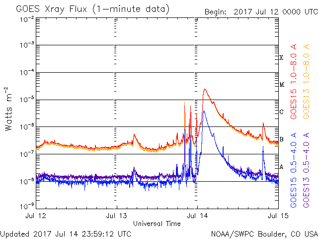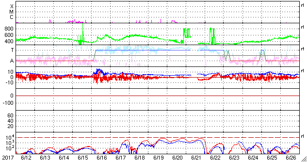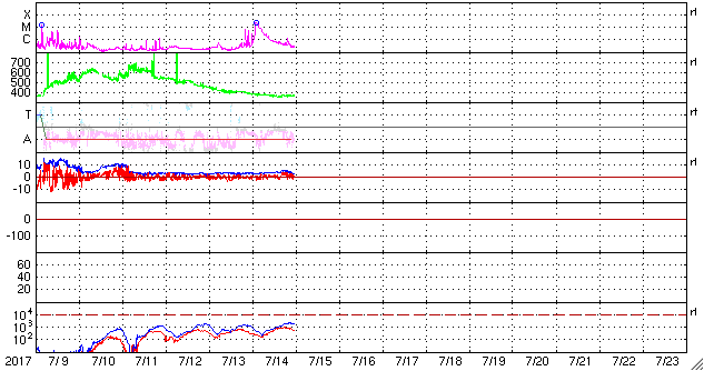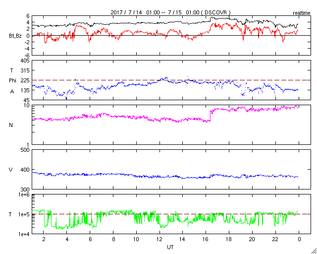 (c) SDO (NASA)、(動画加工 : 宇宙天気ニュース) ![]() M2.4の中規模フレアに伴って噴出したCME。SOHO衛星LASCO C2、C3。 (c) SOHO (ESA & NASA)、 (動画加工 : 宇宙天気ニュース) ![]() 世界時7月14日のAE指数(速報値)。 (c) 京都大学WDC ![]() SDO衛星のAIA193カメラによる太陽コロナの様子 (c) SDO (NASA) ![]() SDO衛星による太陽の可視光写真。マウスの矢印を写真に重ねると、黒点番号付きの写真に切り替わります。 (c) SDO (NASA) ![]() GOES衛星の太陽X線データ (c) NOAA/SWPC ![]() DSCOVRが観測した太陽風の磁場(1番上の枠、黒線は全体の強度、赤線は南北成分) および、太陽風の密度(3番目の紫線)、速度(4番目の青線) (c) データ:NOAA/SWPC、作図:宇宙天気ニュース ![]() 27日の太陽周期に合わせたデータプロット 太陽が同じ面を地球に向けていた27日前の変化から、今後を予想することができます。 (c) 作図:宇宙天気ニュース