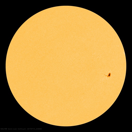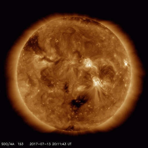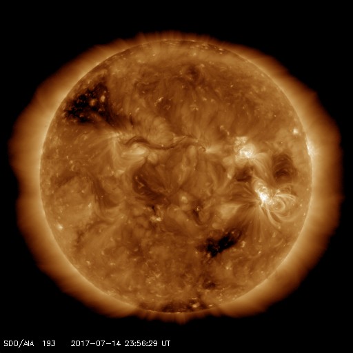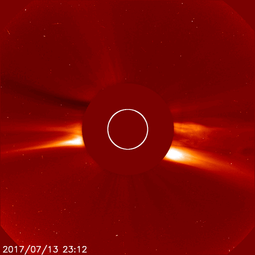 2017/ 7/15 09:03 更新 2665黒点群でM2.4の中規模フレアが発生し、CMEも噴出しています。 担当 篠原 昨日のニュースの直後、14日10時(世界時14日1時)に、 2665黒点群でM2.4の中規模フレアが発生しました。 SDO衛星AIA193、131による動画を掲載します。 フレアの後、プロミネンスのループが美しく輝いています。 Mクラスのフレアの発生は、7月9日のM1.3以来、5日ぶりですが、 M2に達する規模のフレアは、 4月3日のM5.8以来で、およそ3か月ぶりです。 このフレアに伴って、CME(太陽ガスの放出現象)も発生しています。 SOHO衛星による動画を2枚目に掲載します。 フレアが発生した時、2665黒点群は太陽の西寄り(右側)に見えていました。 このため、ガスの濃い領域は右に向かって飛び出していますが、 ガスの淡い広がりが、太陽全体を包む様に噴出しています。 このため、飛び出したコロナのガスは地球の方向にも向かっていると考えられます。 発生から3日ほどで地球に到達すると考えると、 明後日、17日頃になる可能性があります。 太陽風速度の急な高まりや、磁場の強まりがやって来る可能性があります。 特に、磁場が大きく南向きに変化した場合は、 磁気圏の乱れも強まり、激しいオーロラの活動も発生するでしょう。 今後の太陽風の変化に注目して下さい。 現在の太陽風は、速度は360km/秒と低速で、 磁場強度も2〜4nTとやや弱い状態が続いています。 磁場の南北成分は、変化も小さいのですが、 やや北寄りに推移していて、磁気圏は穏やかです。 AE指数のグラフは、小さい変化が時々起きている程度です。