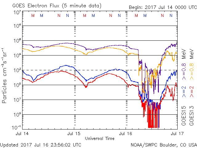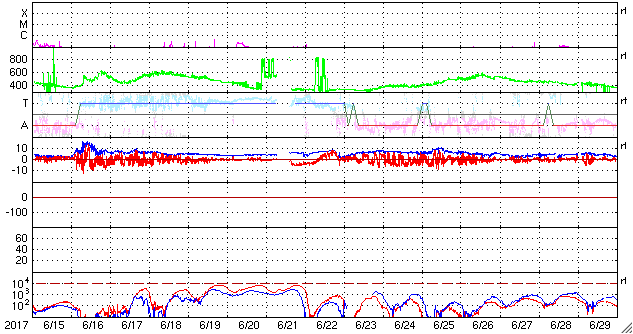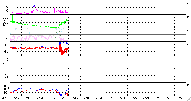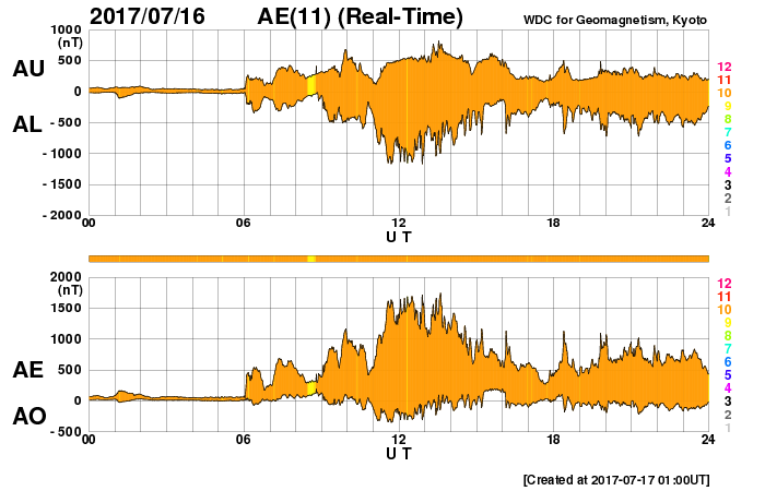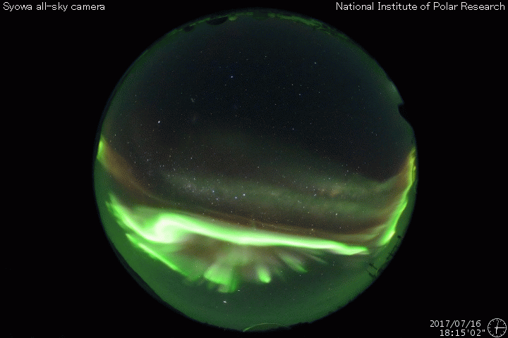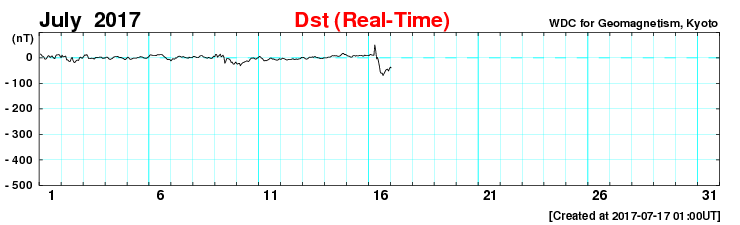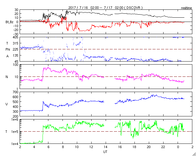 2017/ 7/17 10:09 更新 太陽風の乱れが到来し、磁気圏の活動を強めました。速度は560km/秒に高まっています。 担当 篠原 昨日、16日14時(世界時16日5時)に、 太陽風の急な強まりがDSCOVR衛星で観測されました。 速度は310km/秒から500km/秒へ、 磁場強度は3nTから15nTへ、それぞれ強まっています。 太陽風の乱れは、M2.4フレアの発生から2日ほどで地球に達していて、 予想よりも早い到来だったと思います。 太陽風磁場の南北成分は、初めは0nT付近でしたが、 次第に南寄りに変化するようになり、 磁場強度が20nTに達した16日17時半(世界時16日8時半)以降は、 大きく南寄りに振れて、 -20nTから -10nTの状態が6時間にわたって続きました。 この影響で、磁気圏の活動も活発化して、 AE指数は1700nTに達する激しい変化を記録しています。 世界時16日18時過ぎのオーロラの様子を、 昭和基地の全天カメラの動画で紹介します。 全天カメラでは、この他の時間にも激しいオーロラが撮影されていて、 特に、空が暗くなり始めた頃に撮影された赤いオーロラの様子は、 とても印象的です。 現在の太陽風は、速度は560km/秒へ上がる一方、 磁場強度は10nTへ下がっています。 南北成分は、0nT付近で変化するようになっていて、 磁気圏の活動は少し穏やかになりそうです。 Dst指数の速報値は、-69nTまで変化しています。 中規模の磁気嵐が発生しているようです。 この後、放射線帯高エネルギー電子の変化に注目して下さい。 太陽では、2665黒点群でC1の小規模フレアが5回発生しています。