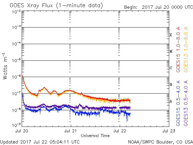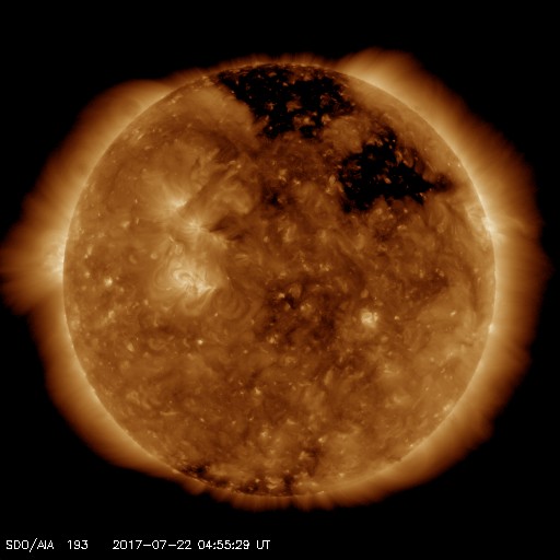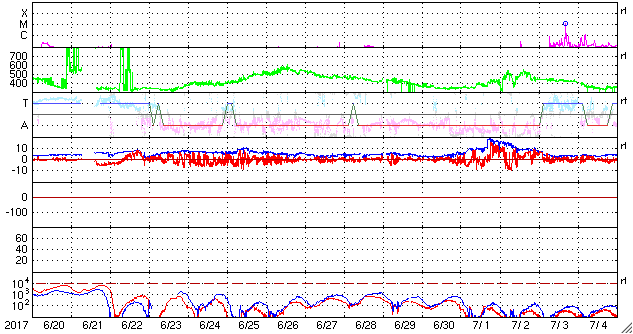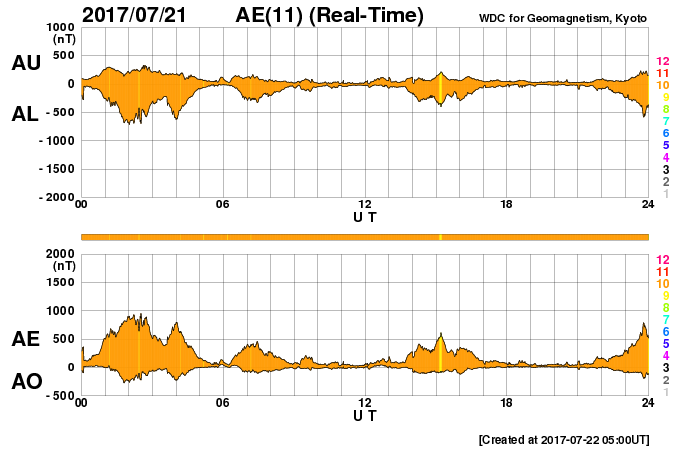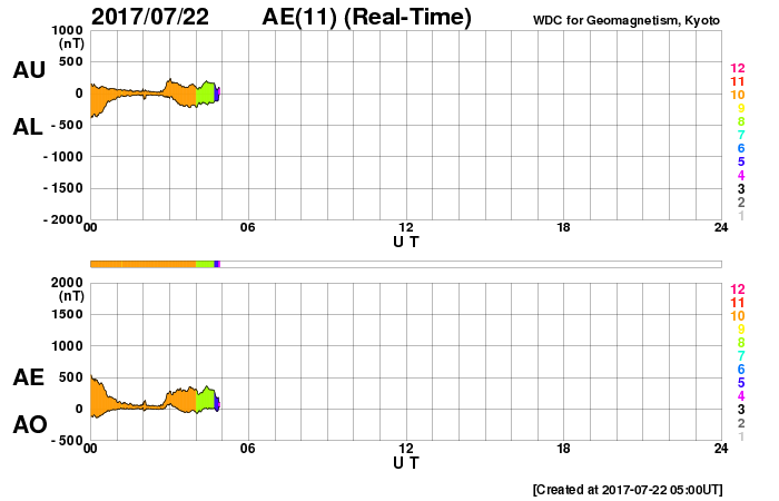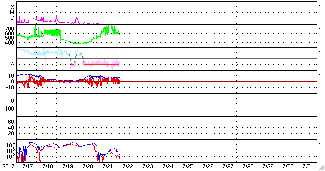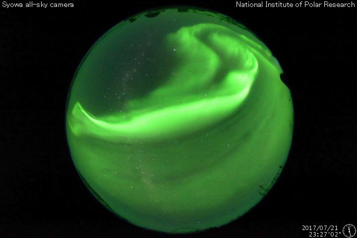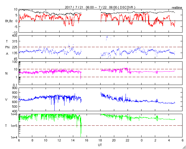 2017/ 7/22 14:04 更新 高速の太陽風が続いています。磁気圏も比較的活動的です。 担当 篠原 太陽風の速度は、昨日の夕方に700km/秒に達しました。 そのまま、今朝早くまで700km/秒台を保ちましたが、 その後次第に低下して、現在は560km/秒まで下がっています。 高速の状態は続いています。 太陽風の磁場強度は、7〜8nTとやや強まった状態が続いています。 南北成分は、全体としては北寄りになっていますが、 南向きに変化する時間帯もあり、 速度が高まっていることと重なって、 磁気圏の活動も高まった状態が続いています。 オーロラの活動度を示すAE指数のグラフは、 500〜800nTの中規模の変化が時間をおいて、度々発生しています。 世界時21日23時半頃の昭和基地のオーロラの動画を掲載します。 オーロラの爆発が始まって、空全体がオーロラの光に覆われていきます。 AE指数のグラフでも、750nTくらいの高まりになっています。 SDO衛星AIA193では、コロナホールは西半球に進み、 高速の太陽風は後半に入っていくでしょう。 太陽は、無黒点の状態が続いています。 X線グラフは、全体の強度も下がり、とても穏やかです。