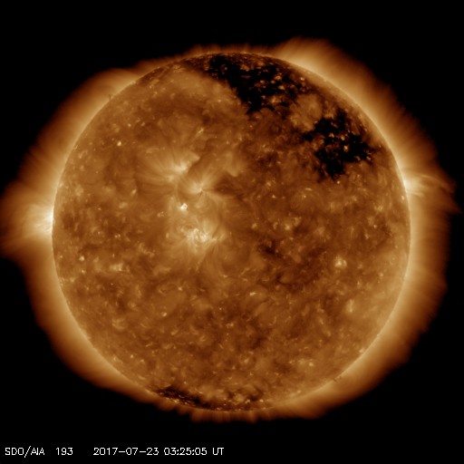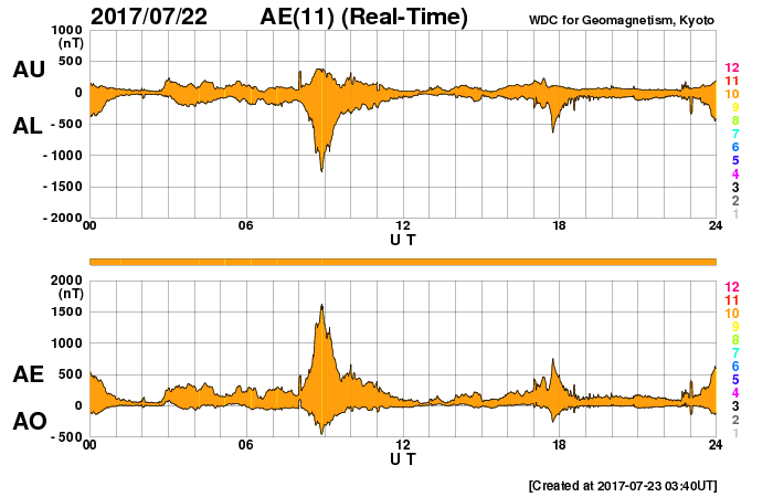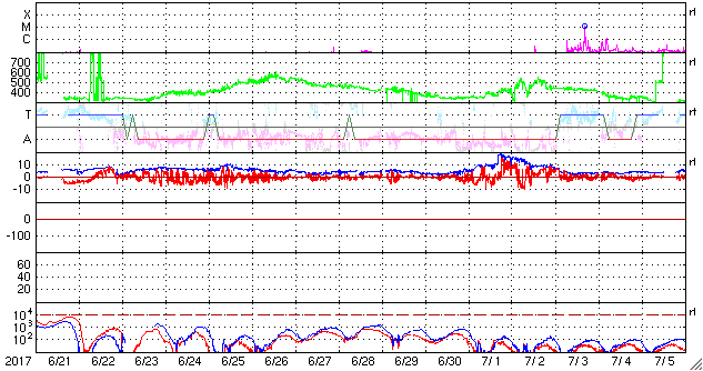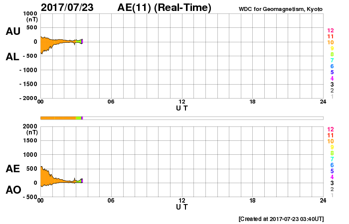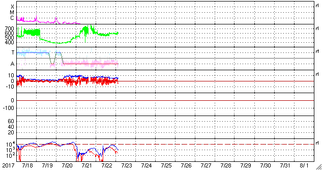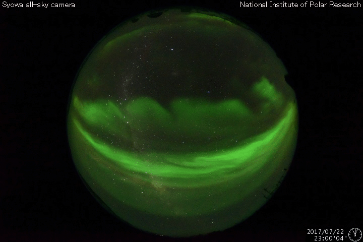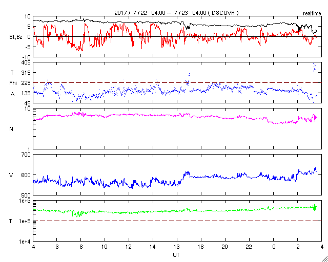 2017/ 7/23 12:41 更新 太陽風は再び600km/秒に高まっています。太陽は無黒点が続いています。 担当 篠原 昨日の夜にかけて、ゆっくりと下がっていた太陽風の速度は、 今日に入ると再び上昇して、600km/秒近くに上がり、 現在まで続いています。 磁場強度は、8nTからゆっくりと下がって、5nTほどになり、 グラフの最後で2nTへ急に落ちています。 高速の太陽風は、これから後半へ向かうことになりそうです。 太陽風磁場の南北成分は、 太陽風のグラフの前半は南北にゆっくりと変化していますが、 後半からは変化が少なくなり、0nT付近で小さく動く程度です。 速度が高まっていることもあり、 磁気圏の活動は、時々大きく高まっていて、 AE指数は、1500nTの激しい変化や、 700nT程度の中規模の活動が数回発生しています。 世界時22日23時頃の昭和基地のオーロラの様子を、 全天カメラの動画で紹介します。 昨日とほとんど同じ時間帯の動画で、 2枚並べて見比べてみて下さい。 SDO衛星AIA193では、コロナホールは西に去りつつあります。 この様子からも、高速風の影響は次第に弱くなって行きそうです。 太陽は、今日も黒点は見えない状態です。 X線グラフも変化はなく、太陽はとても穏やかです。 SDO衛星の観測では、 東端の向こう側から活動的な領域が近づいているようです。 この後、黒点が現れるかどうか注目してください。 ![]() 南極の昭和基地で、世界時22日23時に撮影されたオーロラの様子。 (c) 国立極地研究所、(動画加工 : 宇宙天気ニュース)極地研究所、(動画加工 : 宇宙天気ニュース) ![]() 世界時7月22日のAE指数(速報値)。 (c) 京都大学WDC ![]() 世界時7月23日のAE指数(速報値)。 (c) 京都大学WDC ![]() SDO衛星のAIA193カメラによる太陽コロナの様子 (c) SDO (NASA) ![]() SDO衛星による太陽の可視光写真 (c) SDO (NASA) ![]() DSCOVRが観測した太陽風の磁場(1番上の枠、黒線は全体の強度、赤線は南北成分) および、太陽風の密度(3番目の紫線)、速度(4番目の青線) (c) データ:NOAA/SWPC、作図:宇宙天気ニュース ![]() 27日の太陽周期に合わせたデータプロット 太陽が同じ面を地球に向けていた27日前の変化から、今後を予想することができます。 (c) 作図:宇宙天気ニュース