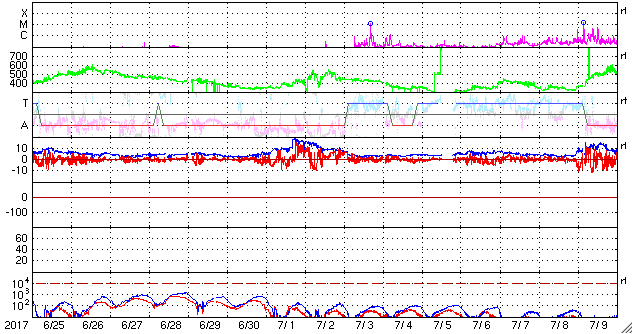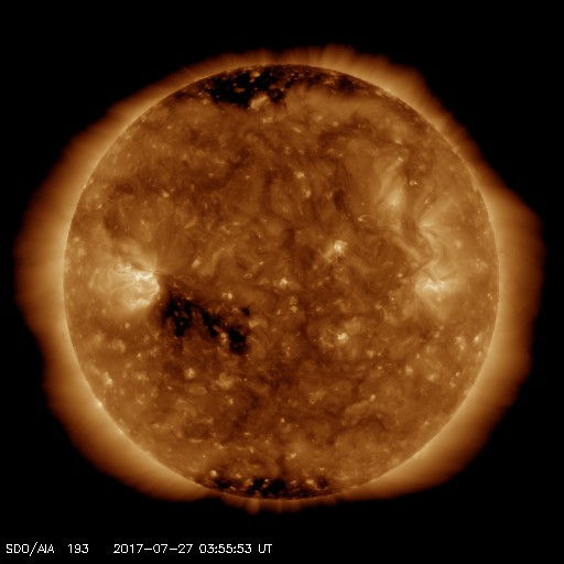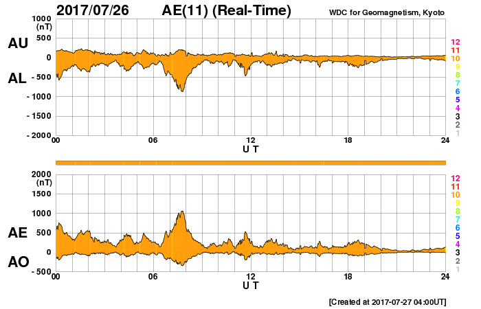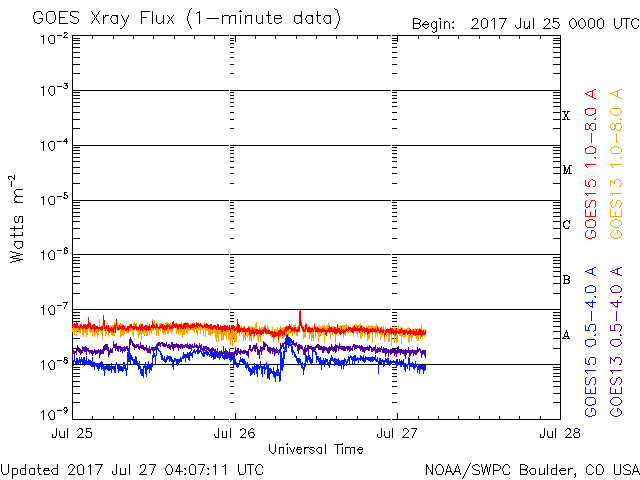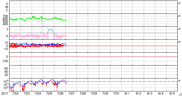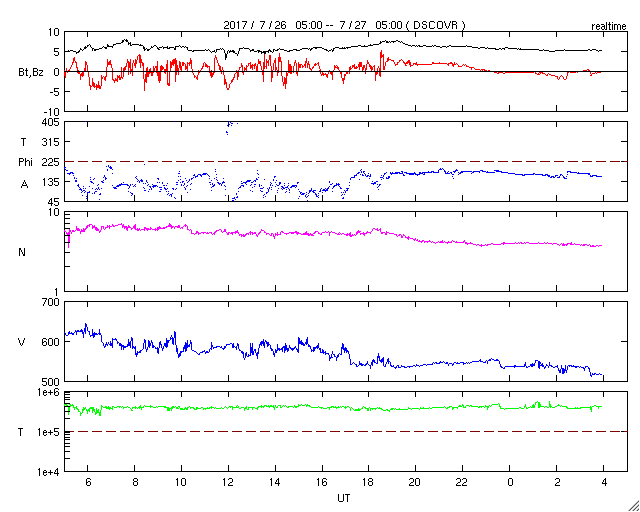 2017/ 7/27 13:07 更新 高速の太陽風は続いていますが、速度は520km/秒に下がっています。 担当 篠原 太陽風の速度は、昨日までは580km/秒を保っていましたが、 今日に入ると550km/秒へ一段下がり、 昼頃には520km/秒へ下がっています。 高速の状態は続いていますが、そろそろ終わりに向かうのでしょうか。 太陽府の磁場強度は、5nT付近を推移していて、 こちらは下がる様子は見られません。 南北成分は、グラフの前半は細かい変化が見られましたが、 後半に入ると変化がなくなり、0nT付近に留まっています。 このため、AE指数のグラフも、 初めは500nT前後の活動が続いていますが、 次第に変化がなくなって、穏やかになっています。 SDO衛星AIA193の太陽写真では、 太陽の中央のやや南東寄り(左下)にコロナホールが見えています。 明日くらいに中央線に達し、その3日後くらいから、 太陽風に高まりをもたらすかもしれません。 太陽は、今日も無黒点の状態です。 X線のグラフも変化はなく、太陽はとても穏やかです。