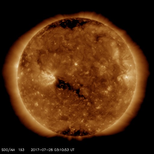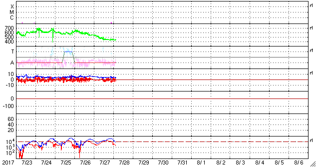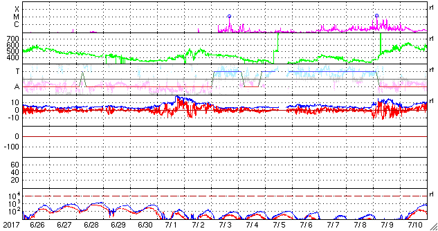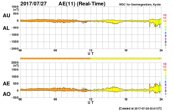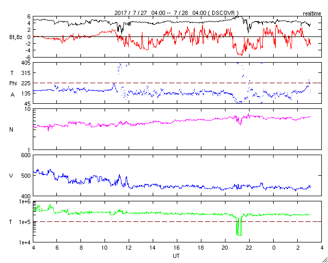 2017/ 7/28 12:20 更新 太陽風の速度は440km/秒に下がり、高速の太陽風は終わりました。 担当 篠原 太陽風の速度は、昨日の昼過ぎに500km/秒台を割り、 夜にかけて更に低下して、440km/秒になり、 現在までこの状態が続いています。 高速の太陽風は終わりを迎えています。 太陽風の磁場強度は、4nTと、 昨日よりも少し下がっていますが、平均的な状態です。 南北成分は、変化は小さいですが、南北に振れる様になり、 磁気圏の活動も、 AE指数で250〜500nTの小規模の変化が見られる様になっています。 太陽風は落ち着いてきましたが、 SDO衛星AIA193の太陽写真では、太陽の中央部に、 あまり広くはありませんがコロナホールが見えています。 3日後くらいから、太陽風の高まりが再び始まるかもしれません。 太陽は、無黒点の状態が続いています。 X線グラフもほとんど変化はなく、太陽はとても静かです。 今回の高速太陽風の影響を受けて、 放射線帯の高エネルギー電子も増加しています。 23日から10,000に達していて、4日を経過しています。 ![]() 世界時7月27日のAE指数(速報値)。 (c) 京都大学WDC ![]() 世界時7月28日のAE指数(速報値)。 (c) 京都大学WDC ![]() SDO衛星のAIA193カメラによる太陽コロナの様子 (c) SDO (NASA) ![]() SDO衛星による太陽の可視光写真 (c) SDO (NASA) ![]() DSCOVRが観測した太陽風の磁場(1番上の枠、黒線は全体の強度、赤線は南北成分) および、太陽風の密度(3番目の紫線)、速度(4番目の青線) (c) データ:NOAA/SWPC、作図:宇宙天気ニュース ![]() 27日の太陽周期に合わせたデータプロット 太陽が同じ面を地球に向けていた27日前の変化から、今後を予想することができます。 (c) 作図:宇宙天気ニュース