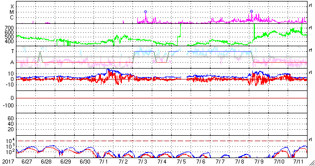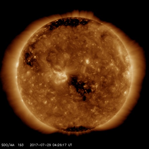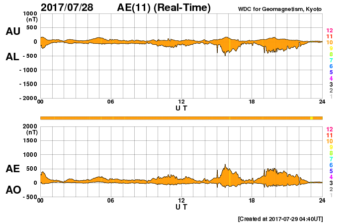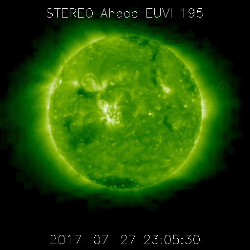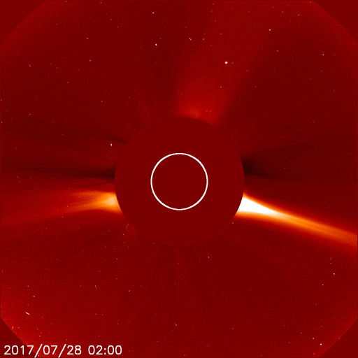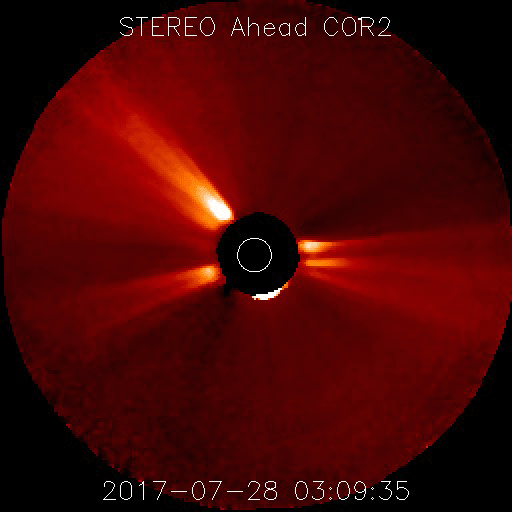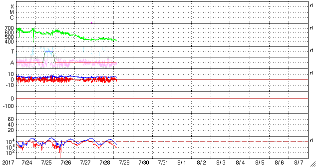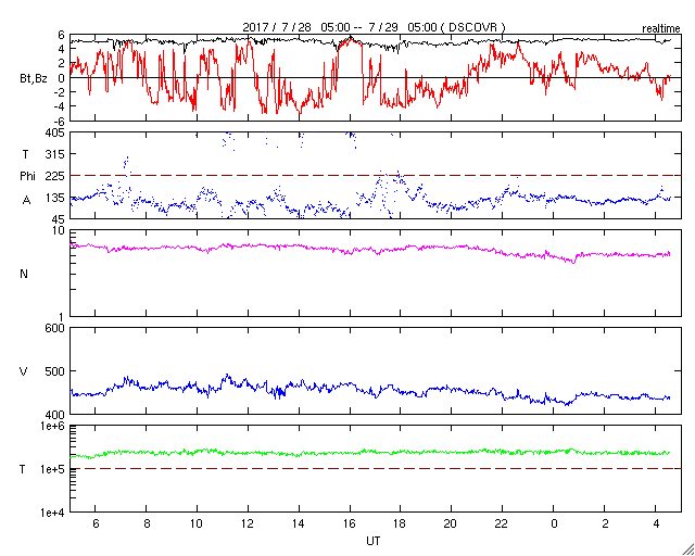 2017/ 7/29 13:45 更新 太陽の向こう側で再び激しいフレアとCMEが発生しました。 担当 篠原 7月23日に太陽の向こう側で大きなフレアを起こし、 CMEも発生させた(24日記事)2665黒点群が、 再び大規模なフレアとCMEを起こしています。 今日の1枚目の動画は、SOHO衛星LASCO C2、C3による CME(太陽ガスの放出現象)の様子です。 28日14時(世界時28日5時)から、 太陽の左に向かってコロナのガスが激しく噴出しています。 前回のCMEでは、発生源の2665黒点群は太陽の反対の中心近くにあったため、 ガスは太陽を丸く囲むように飛び出して行きました。 今回は、2665群が地球から見て太陽の向こう側の左寄りに進んでいるため、 CMEは左側に偏った広がり方をしています。 一方、太陽の左向こうで観測しているSTEREO Ahead衛星から見ると、 2665群は太陽のほぼ中央に見えています。 2枚目の動画は、STEREO Ahead衛星のEUVI195による撮影です。 前回のフレアと同等の爆発が見えています。 3枚目の動画は、STEREO Ahead衛星のCOR2カメラの撮影です。 衛星に向かうように、CMEのガスは丸く全方位に広がっています。 前回もそうでしたが、このCMEがもう10日ほど遅く発生していれば、 地球に激しいオーロラの乱れなどを起こしたかもしれません。 もう3〜4日ほどすると、2665群は太陽の東端に姿を現しそうです。 活発な状態が続いているかどうか分かりませんが、 注目してください。 現在の太陽風は、440〜460km/秒と安定しています。 磁場強度も、5nTと平均的な状態です。 磁場の南北成分は、南北それぞれに変化しています。 AE指数は500nTの中規模の変化が2回起きていて、 ある程度の活動度を保っています。 太陽は、今日も無黒点です。 X線のグラフはほとんど変化はなく、 太陽のこちら側は、とても穏やかです。 ![]() 太陽の向こう側で発生したフレアによるCME。SOHO衛星LASCO C2、C3。 (c) SOHO (ESA & NASA)、 (動画加工 : 宇宙天気ニュース) ![]() STEREO Ahead衛星EUVI195カメラによる、太陽の向こう側で発生したフレア。 (c) STEREO (NASA)、 (動画加工 : 宇宙天気ニュース) ![]() STEREO Ahead衛星COR2カメラによる、太陽の向こう側で発生したCME。 (c) STEREO (NASA)、 (動画加工 : 宇宙天気ニュース) ![]() 世界時7月28日のAE指数(速報値)。 (c) 京都大学WDC ![]() 世界時7月29日のAE指数(速報値)。 (c) 京都大学WDC ![]() SDO衛星のAIA193カメラによる太陽コロナの様子 (c) SDO (NASA) ![]() SDO衛星による太陽の可視光写真 (c) SDO (NASA) ![]() DSCOVRが観測した太陽風の磁場(1番上の枠、黒線は全体の強度、赤線は南北成分) および、太陽風の密度(3番目の紫線)、速度(4番目の青線) (c) データ:NOAA/SWPC、作図:宇宙天気ニュース ![]() 27日の太陽周期に合わせたデータプロット 太陽が同じ面を地球に向けていた27日前の変化から、今後を予想することができます。 (c) 作図:宇宙天気ニュース