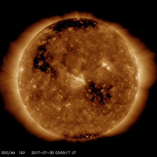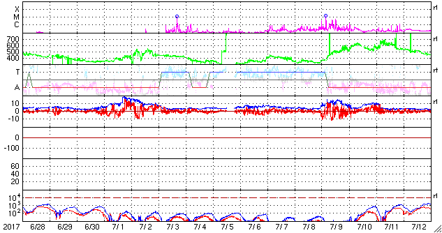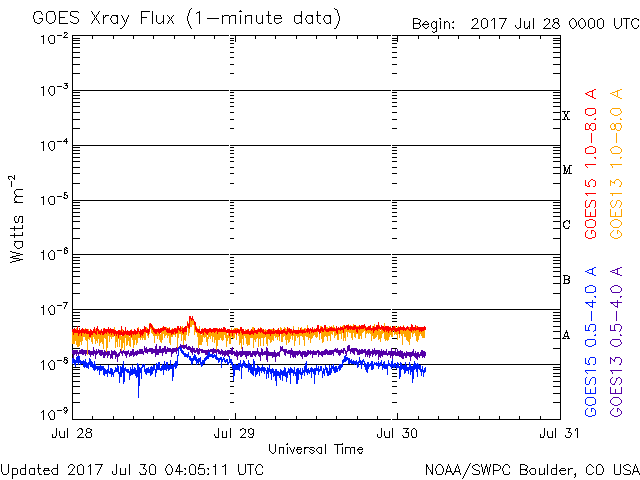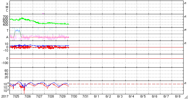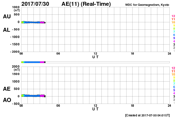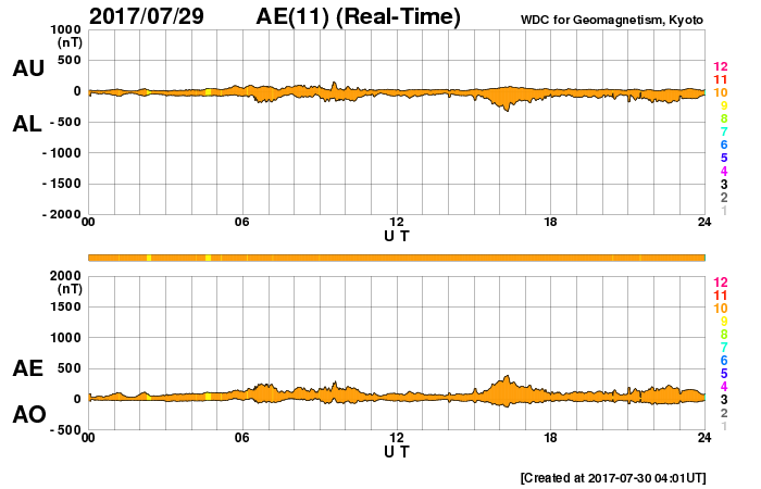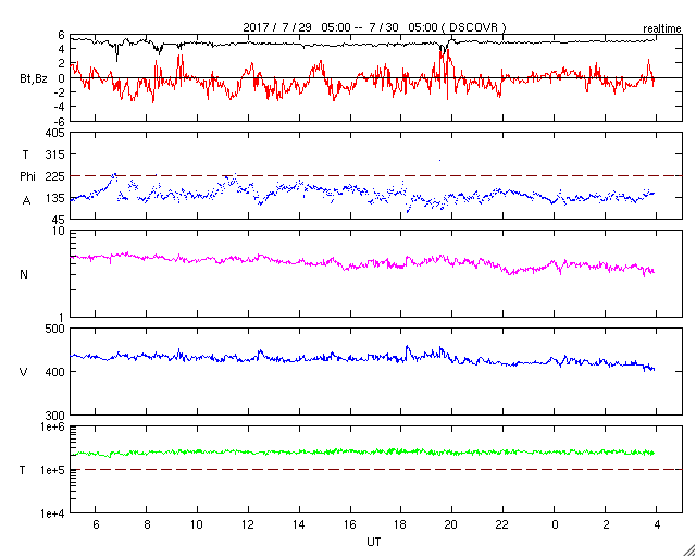 2017/ 7/30 13:06 更新 太陽風は平均的な状態です。小さい黒点が出現しています。 担当 篠原 太陽風の速度は、450km/秒から410km/秒へ少し下がっています。 磁場強度は、5nTで安定しています。 磁場の南北成分は、変化は小さくなっていますが、 全体としては南寄りになっています。 このため、磁気圏では小さい規模の活動が起きているようで、 AE指数は200nT前後の小さい変化が続いています。 SDO衛星AIA193では、 太陽中央部の南半球のコロナホールが西に進み、 地球へ影響が及び始める目安の位置に近づいています。 今後、太陽風がある程度高まって行く可能性があります。 どの程度の変化になるか、注目してください。 太陽は、中央部の北西寄り(右上)に、 小さく2669黒点群が出現しています。 写真では、右下にも別の黒点が見えているようです。 X線のグラフには目立った変化はなく、 フレアの活動は特に起きていません。