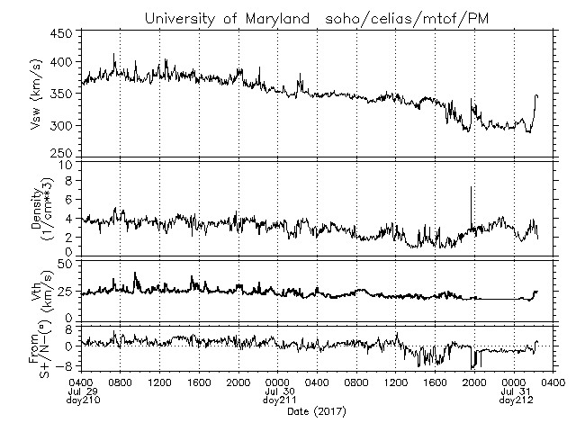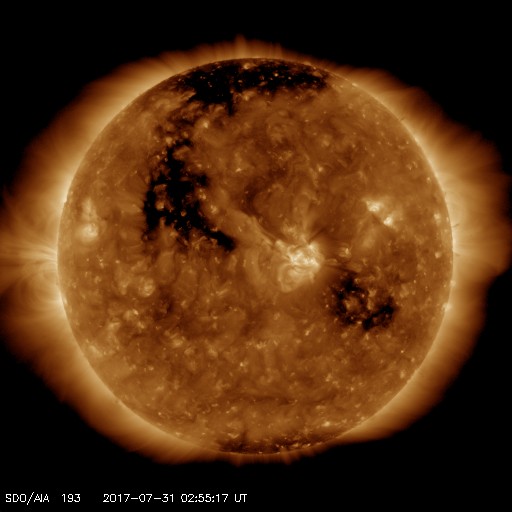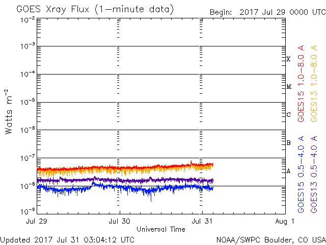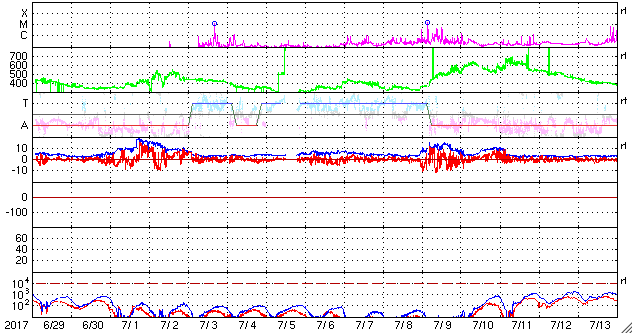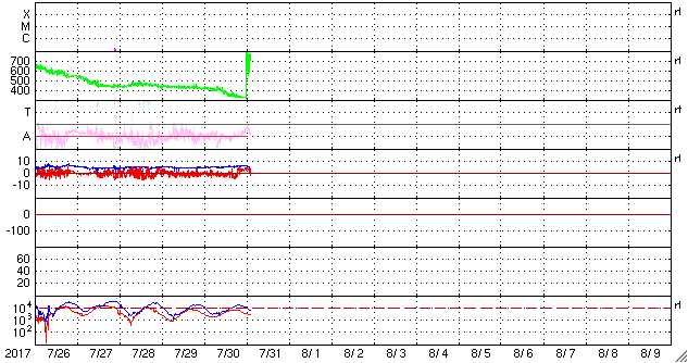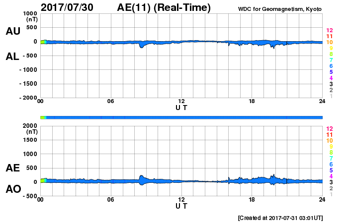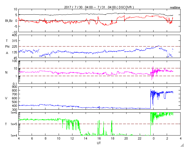 2017/ 7/31 12:04 更新 太陽風の速度は少し高まっていますが、低速の状態です。太陽は無黒点に戻っています。 担当 篠原 DSCOVR衛星の太陽風データが、グラフの最後で750km/秒に高まっています。 コロナホールの影響が近づいていると書いていましたが、 ここまで速度が高まるほどの規模には見えなかったので、 観測データの異常ではないかと思います。 こういう時は、ACE衛星のデータを参照できると良いのですが、 残念ながら、リアルタイムのデータ受信が行われていないようで、 この時間帯は欠測になっています。 3番目の方法として、 SOHO衛星の太陽風データを紹介します(今日の1枚目の図)。 このグラフによると、太陽風の速度は今朝にかけてゆっくりと低下して、 300km/秒まで下がり、 お昼前の31日11時(世界時31日2時)に、 350km/秒へ小幅の上昇を示しています。 この変化がコロナホールの影響によるのかは、 もうしばらく変化を見る必要がありますが、 現在も太陽風は低速の状態にあるようです。 太陽風の磁場強度は、5nTと平均的な値で安定しています。 南北成分の変化は小幅で、南寄りになった時に、 弱い磁気圏活動が発生しているようです。 AE指数のグラフでは、200nT程度の小さい変化になっています。 SDO衛星AIA193の太陽写真では、 南西(右下)のコロナホールの影響が地球に及び始めても良い頃です。 太陽は、昨日見えていた小さい黒点は消えてしまい、 無黒点に戻っています。 X線のグラフも変化はなく、太陽はとても穏やかです。