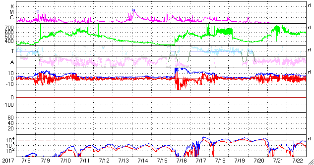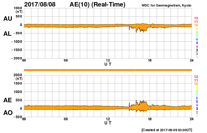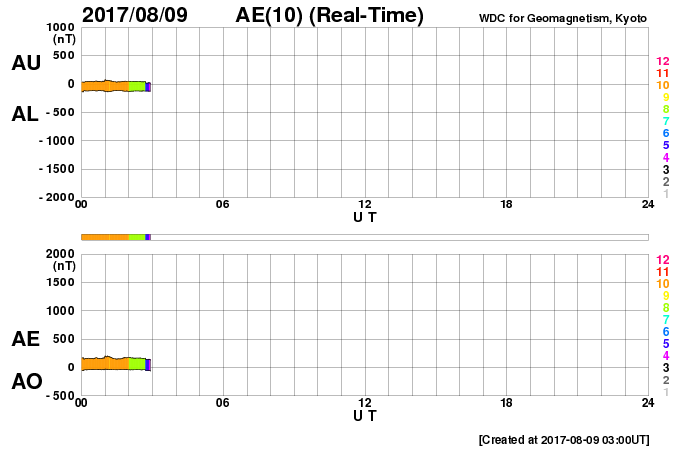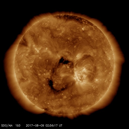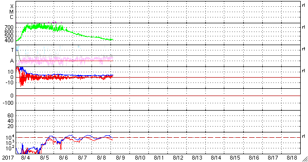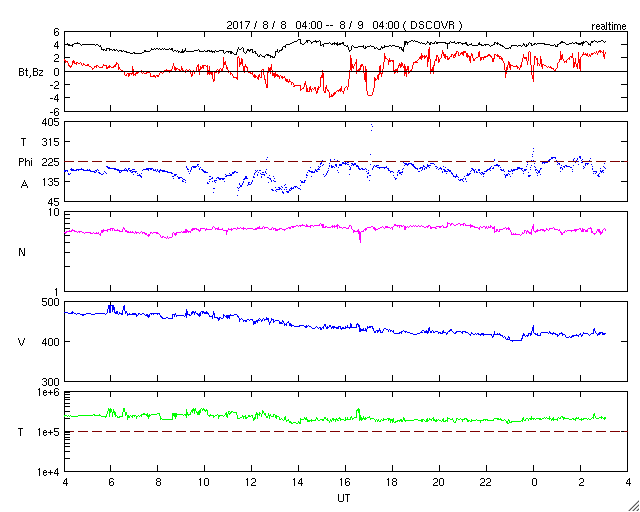 2017/ 8/ 9 12:13 更新 太陽風は平均的な状態に戻りました。磁気圏も穏やかです。 担当 篠原 太陽風の速度は、今朝にかけてゆっくりと低下が続き、 420km/秒と平均的な速さに戻っています。 磁場強度も、4nTと平均的な状態で安定しています。 磁気圏の活動も穏やかに推移しています。 27日周期の図では、 今回の高速風の速度変化の全体が見えています (磁場の変化は、1日分通り過ぎています)。 8月4日に始まった速度の高まりは、4日ほど続きました。 この後、太陽風の速度は一旦落ち着いて、 次の変化をもたらすと考えられるコロナホールが、 SDO衛星AIA193の太陽写真の中央部に見えています。 これまで、赤道域のコロナホールが目立っていましたが、 正面に来ると、南半球の低緯度側のコロナホールも ある程度の広がりを持っています。 この領域の影響も重なって、 太陽風の変化はしっかりとやって来るかもしれません。 3日後くらいに注目してください。 太陽は、今日も穏やかです。 黒点も2670群が見えるだけです。 放射線帯の高エネルギー電子は、 今日も2つの衛星で10,000に達しています。 増加は終わって、これからゆっくりと減少を始めそうです。