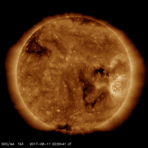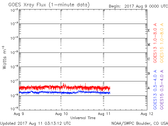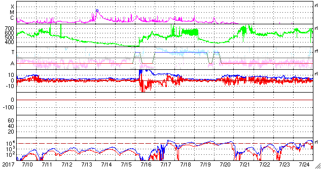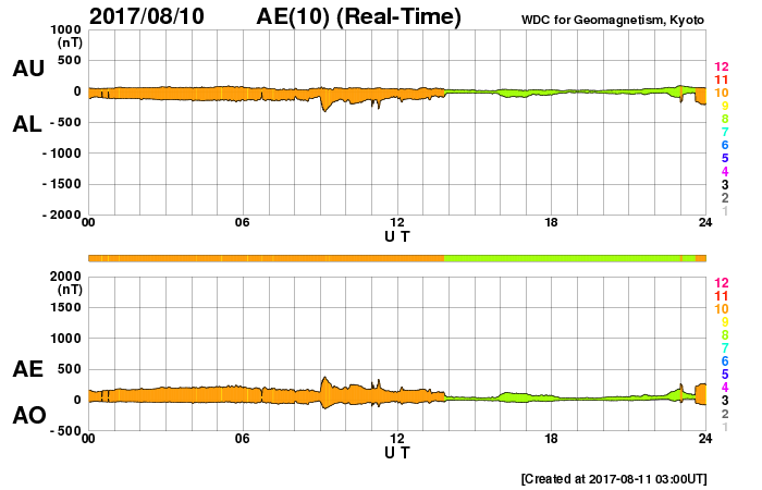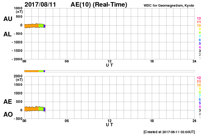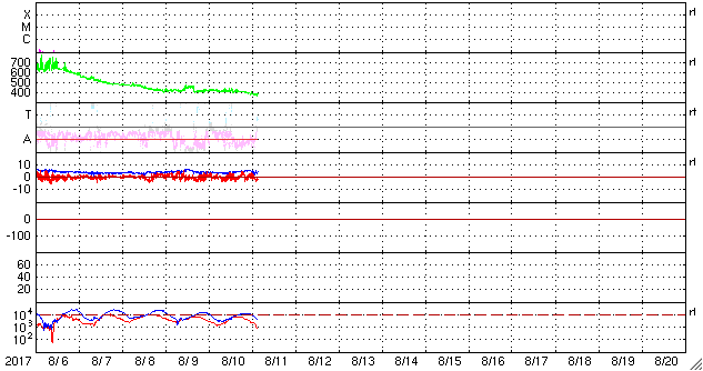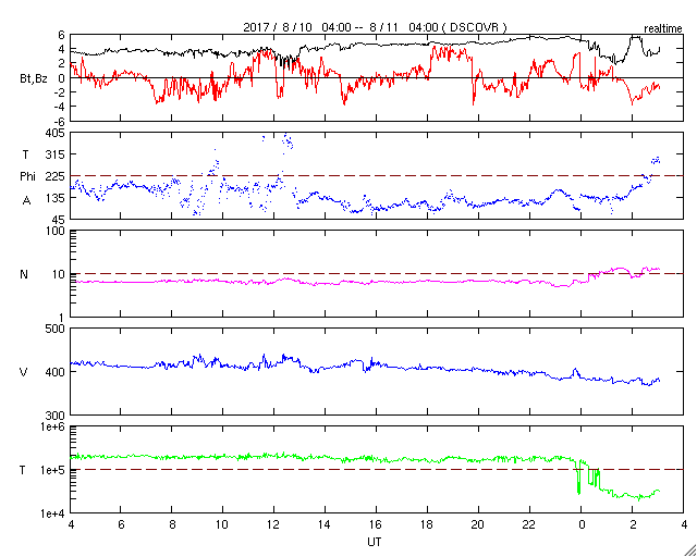 2017/ 8/11 12:13 更新 太陽風は穏やかで、磁気圏も静穏です。 担当 篠原 太陽風の速度は380km/秒へ少し下がり、 やや低速の状態になっています。 磁場強度は、5nT前後へ少し上がっていますが、 平均的な強度です。 磁場の南北成分は、小さく南北に変化しています。 磁気圏は穏やかですが、AE指数のグラフには、 時々小規模の変化も発生しています。 SDO衛星AIA193では、 中央部のコロナホールが西半球に進み、 北東の端(左上)から、新しいコロナホールが姿を現しています。 この領域は27日前にも見えていて、 27日周期の図の7月20、21日に始まった 高速太陽風をもたらしています。 今回も同様の推移を仮定すると、 8月16、17日頃から変化が始まりそうです。 太陽は、X線のグラフに変化はなく、 とても穏やかな状態が続いています。 放射線帯の高エネルギー電子は、 青線のGOES15は、今日も10,000に達しています。 太陽風に変化が来なければ、 このままゆっくりと減少していくでしょう。