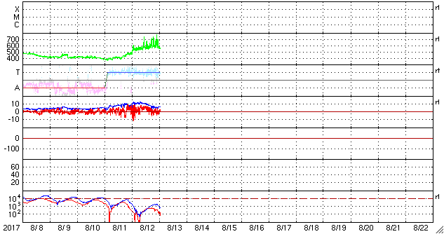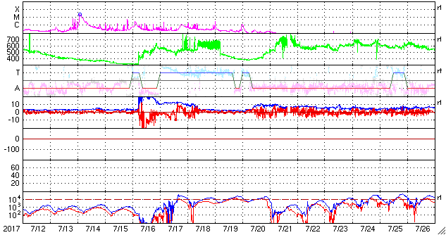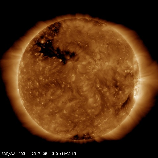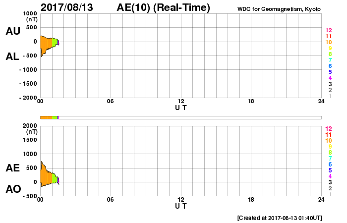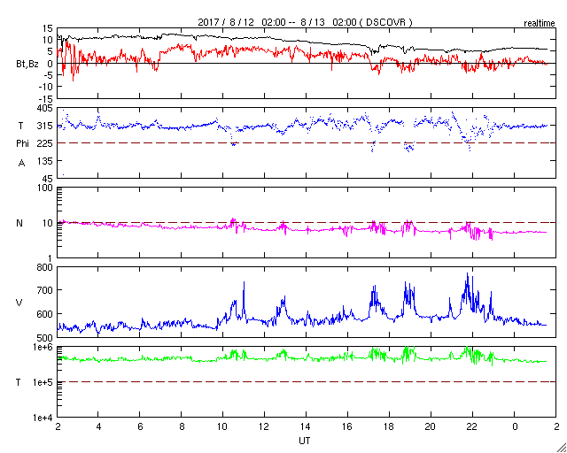 2017/ 8/13 10:49 更新 高速の太陽風が続いています。2670黒点群は太陽の端に近づいています。 担当 篠原 太陽風は、昨夜から今朝にかけて、 550km/秒から600km/秒へ速度が少し高まる変化が見られました。 反対に、磁場強度は10nTから5nTへ下がっています。 その後、速度は550km/秒へ下がっています。 今回の高速太陽風はピークを越えた様です。 太陽風磁場の南北成分は、 グラフの前半は北寄り、後半は南北に小さく変化しています。 このため、AE指数のグラフも前半は静かな状態が続き、 その後、500nT程度の中規模の変化が発生しています。 SDO衛星AIA193では、 北半球のコロナホールの先頭(右端)が、 太陽の中心線に達しています。 3日後の、16日頃から太陽風に影響が始まりそうです。 現在の高速風が終わると、すぐにこちらの変化に切り替わりそうです。 太陽は、2670黒点群が西の端に近づいています。 この他に黒点は見られず、太陽は無黒点になりそうです。 ![]() 世界時8月12日のAE指数(速報値)。 (c) 京都大学WDC ![]() 世界時8月13日のAE指数(速報値)。 (c) 京都大学WDC ![]() SDO衛星のAIA193カメラによる太陽コロナの様子 (c) SDO (NASA) ![]() SDO衛星による太陽の可視光写真。マウスの矢印を写真に重ねると、黒点番号付きの写真に切り替わります。 (c) SDO (NASA) ![]() DSCOVRが観測した太陽風の磁場(1番上の枠、黒線は全体の強度、赤線は南北成分) および、太陽風の密度(3番目の紫線)、速度(4番目の青線) (c) データ:NOAA/SWPC、作図:宇宙天気ニュース ![]() 27日の太陽周期に合わせたデータプロット 太陽が同じ面を地球に向けていた27日前の変化から、今後を予想することができます。 (c) 作図:宇宙天気ニュース