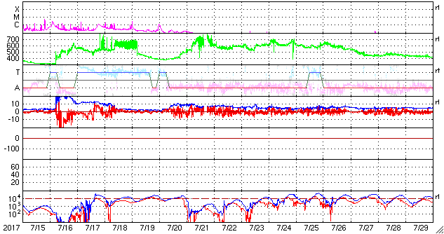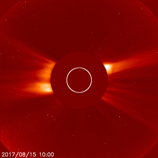 2017/ 8/16 14:31 更新 小規模のCMEが発生しています。太陽風は低速です。 担当 篠原 太陽の東端の2671黒点群が少し大きくなっています。 昨夜、15日21時半(世界時15日12時半)に、 C1.1の小規模フレアを起こしましたが、 CME(太陽ガスの放出現象)を伴っていて、 SOHO衛星のLASCO C2、C3カメラでは、 太陽の左に向かって飛び出すCMEの様子が撮影されています。 横に向かっているため、地球への影響はありません。 2671黒点群は、小さい活動を活発に起こしています。 引き続き注目してください。 太陽風は、速度が360km/秒まで下がり、 低速の風に変わっています。 磁場強度は、3nTから5nTに上がる変化が起きていますが、 平均的な値に戻った程度です。 磁気圏は静穏で、AE指数はほとんど変化がありません。 SDO衛星AIA193では、 北半球のコロナホールが更に西に進んでいます。 地球へ影響が及び始める目安の位置に達しつつあり、 今後、太陽風に変化が始まる可能性があります。 明日から8月26日にかけて、海外へ出かけるため、 ニュースの更新が不定期になります。 可能な範囲で更新を行いますが、お休みする可能性も高いです。 ご了解下さい。