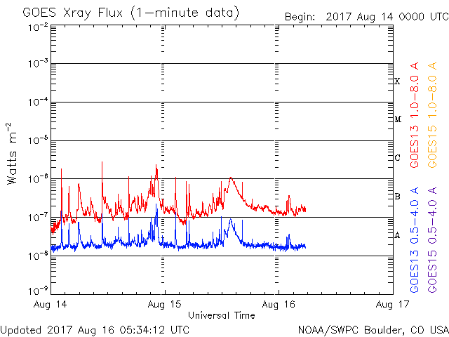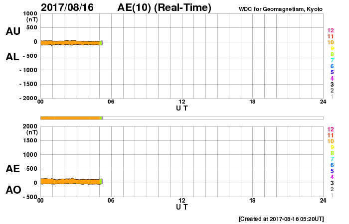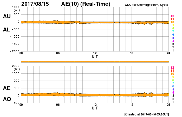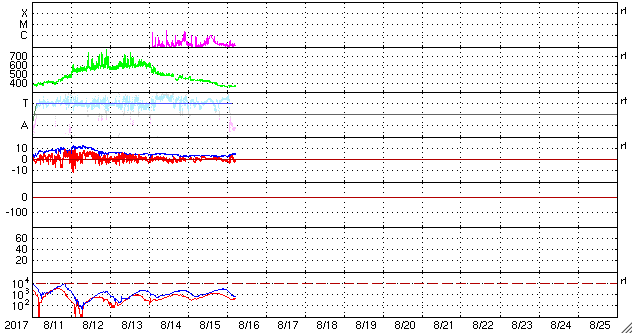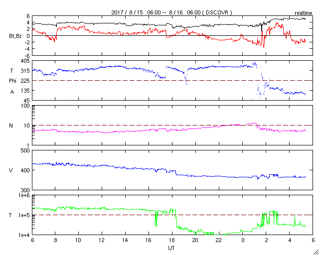 (c) SOHO (ESA & NASA)、 (動画加工 : 宇宙天気ニュース) ![]() 世界時8月15日のAE指数(速報値)。 (c) 京都大学WDC ![]() 世界時8月16日のAE指数(速報値)。 (c) 京都大学WDC ![]() SDO衛星のAIA193カメラによる太陽コロナの様子 (c) SDO (NASA) ![]() SDO衛星による太陽の可視光写真。マウスの矢印を写真に重ねると、黒点番号付きの写真に切り替わります。 (c) SDO (NASA) ![]() GOES衛星の太陽X線データ (c) NOAA/SWPC ![]() DSCOVRが観測した太陽風の磁場(1番上の枠、黒線は全体の強度、赤線は南北成分) および、太陽風の密度(3番目の紫線)、速度(4番目の青線) (c) データ:NOAA/SWPC、作図:宇宙天気ニュース ![]() 27日の太陽周期に合わせたデータプロット 太陽が同じ面を地球に向けていた27日前の変化から、今後を予想することができます。 (c) 作図:宇宙天気ニュース
