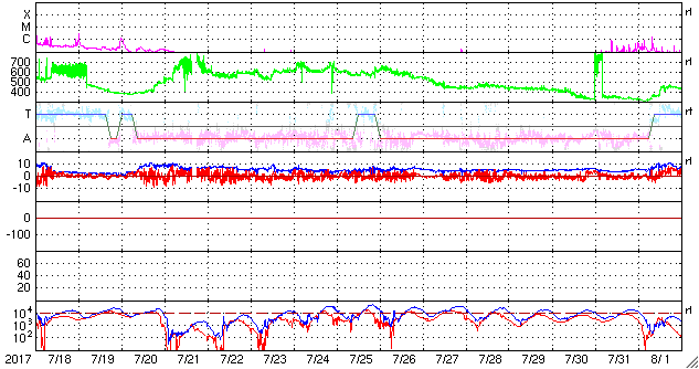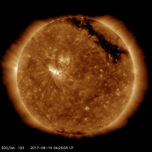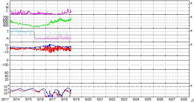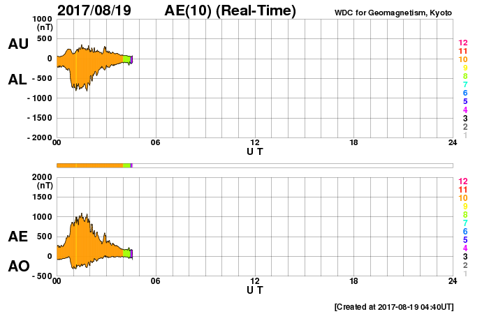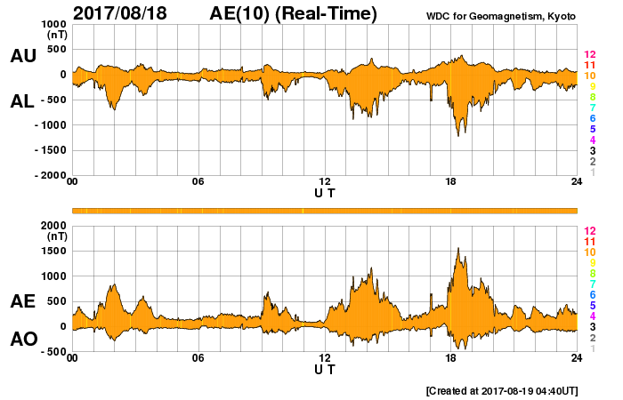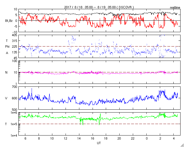 2017/ 8/19 13:42 更新 600km/秒の高速太陽風が続き、磁気圏の活動も強まっています。 担当 篠原 太陽風の速度は、昨日のニュースの後に600km/秒に高まり、 以降、安定した高速風が続いています。 磁場強度も、5〜7nTと少し強い状態が続いています。 コロナホールの影響が強まっています。 太陽風磁場の南北成分は、 -5nTの南向きの変化が頻繁に発生しています。 このため、磁気圏の活動は活発になっていて、 オーロラの活動度を表すAE指数のグラフは、 500nTから1000nTの中規模の活動や、 1500nTに達する激しい変化が続いています。 27日周期の図では、高速の太陽風は更に4日ほど続いています。 今回も引き続き、太陽風の変化や磁気圏活動の高まりに注目してください。 太陽は、東端の向こう側で、 C4.4、C3.5と小規模フレアが2回発生したようです。 詳しくデータを見ることができないのですが、 この後、どのような領域が姿を現すでしょうか。 今日は、ソルトレイクシティに来ています。 宿のWi-Fiの状態が非常に悪く、詳しくデータを見ることができません。 このため、最小限の更新内容にしています。 明日はアイダホ州の外れに移動します。
