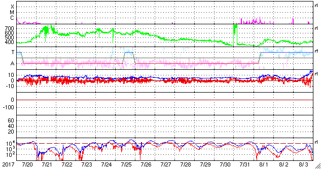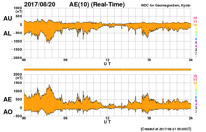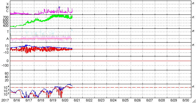 - 2017/ 8/18 07:45 高速太陽風が到来し、激しい磁気圏の活動も発生しています。