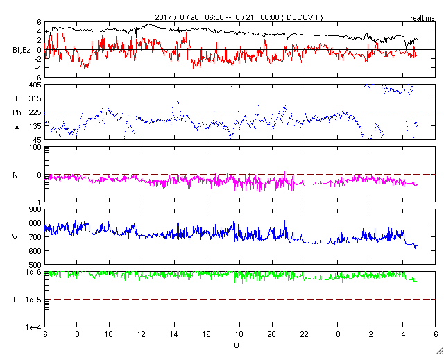 - 2017/ 8/19 13:42 600km/秒の高速太陽風が続き、磁気圏の活動も強まっています。
