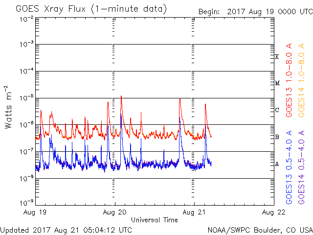 - 2017/ 8/20 14:29 太陽風は750km/秒に速度が高まっています。M1の中規模フレアが発生しました。