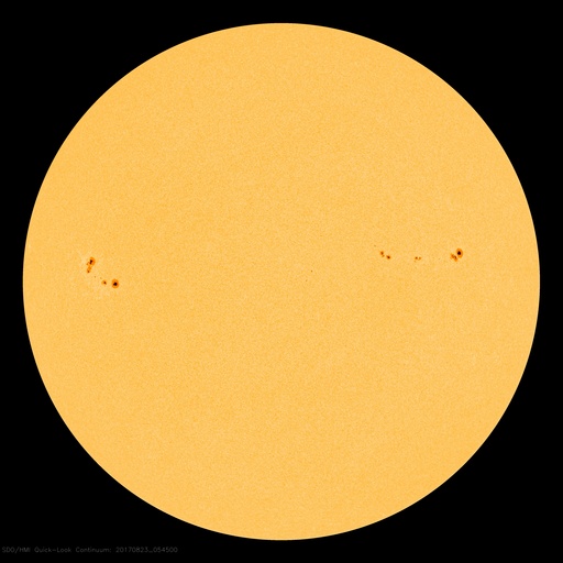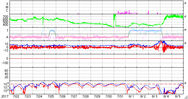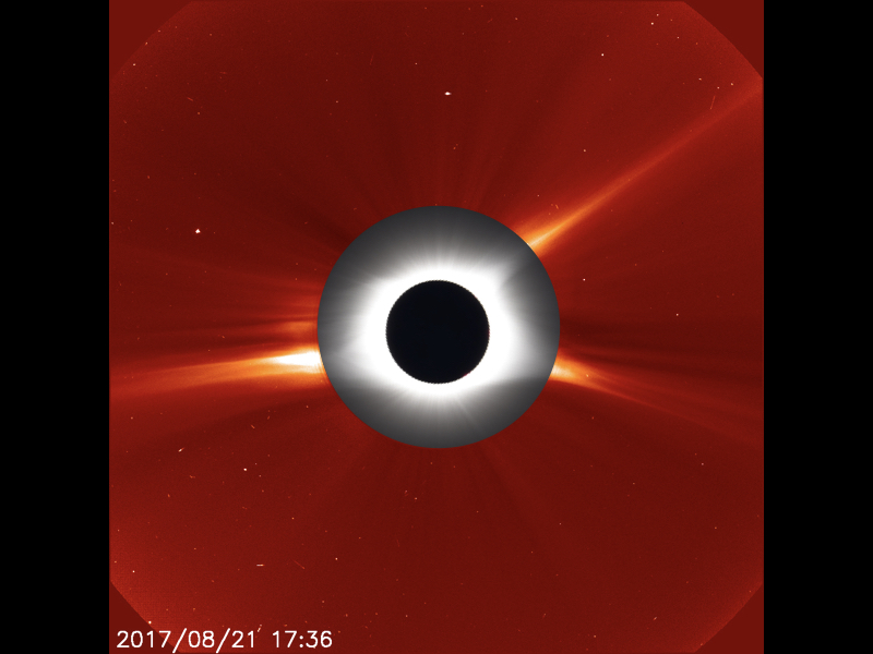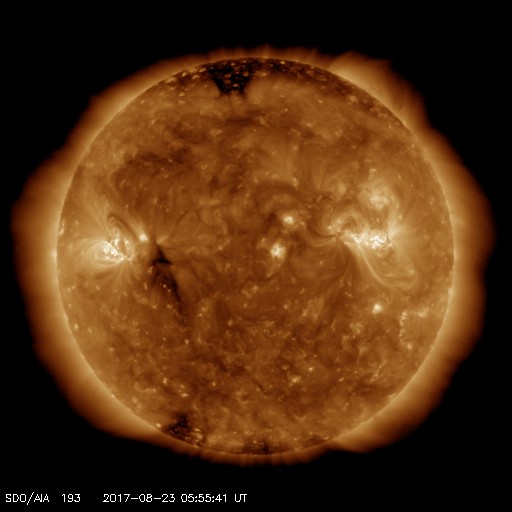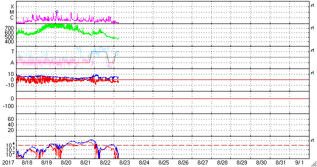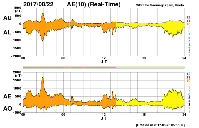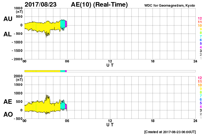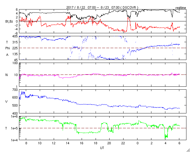 2017/ 8/23 15:11 更新 高速太陽風は終わりに近付いています。21日の皆既日食の写真をどうぞ。 担当 篠原 19日のニュースで、「アイダホ州の外れへ行きます」 と言ったきりになっていましたが、 21日の皆既日食は、快晴の空の下で見ることができました。 澄んだ空気の中で、コロナの透明感のある白い光が、 太陽から様々な方向に飛び出していく様子がとても印象的でした。 皆既日食を見に出かけたのは久しぶりだったこともあり、 皆既中は様々なミスをしてしまいました。 掲載の写真も辛うじて撮影できたもので、 拡大するとピントも少しずれています。 コロナの広がりは、太陽活動の極小期らしい、 東西方向への広がりになっていました。 参考に、ほぼ同じ時刻のSOHO衛星LASCO C2のコロナ写真に重ねてみます。 細い筋も含めて、きれいに繋がっています。 帰国は26日の予定で、もうしばらく不安定な更新になります。 太陽風の速度は、650km/秒から460km/秒へ一気に下がってしまい、 やや高速という状態です。 昨日の速度上昇は、一時的な変化だったようで、 27日周期の図を見ると、前周期とほとんど同じタイミングで、 高速太陽風は終わりを迎えようとしています。 太陽風の磁場強度は、4〜6nTと平均的な強さが続いています。 南北成分は、南寄りの変化が続いていて、 このため、磁気圏活動の活発な状態は続き、 AE指数は、500nTや1000nTの変化が続いています。 ただし、太陽風の速度が低下してきたため、 活動の規模は次第に小さくなっているようです。 この後、太陽風が穏やかになると、 磁気圏の活動も落ち着いて行くでしょう。 太陽は、2671黒点群でC1の小規模フレアが3回発生しています。 X線グラフは、強度が次第に弱くなっていて、 黒点群の活動は弱まっている様です。 ![]() 現地8月21日11時35分(世界時17時35分)に、アイダホ州で撮影した皆既日食。露出を短めにしてプロミネンスを撮影。 (c) 篠原 学 ![]() 現地8月21日11時35分(世界時17時35分)に、アイダホ州で撮影した皆既日食。露出を長めにしてコロナを撮影。 (c) 篠原 学 ![]() 皆既日食中に撮影されたコロナと、SOHO衛星LASCO C2のコロナグラフの比較。 (c) SOHO (ESA & NASA)、篠原 学 ![]() 世界時8月22日のAE指数(速報値)。 (c) 京都大学WDC ![]() 世界時8月23日のAE指数(速報値)。 (c) 京都大学WDC ![]() SDO衛星のAIA193カメラによる太陽コロナの様子 (c) SDO (NASA) ![]() SDO衛星による太陽の可視光写真。マウスの矢印を写真に重ねると、黒点番号付きの写真に切り替わります。 (c) SDO (NASA) ![]() DSCOVRが観測した太陽風の磁場(1番上の枠、黒線は全体の強度、赤線は南北成分) および、太陽風の密度(3番目の紫線)、速度(4番目の青線) (c) データ:NOAA/SWPC、作図:宇宙天気ニュース ![]() 27日の太陽周期に合わせたデータプロット 太陽が同じ面を地球に向けていた27日前の変化から、今後を予想することができます。 (c) 作図:宇宙天気ニュース