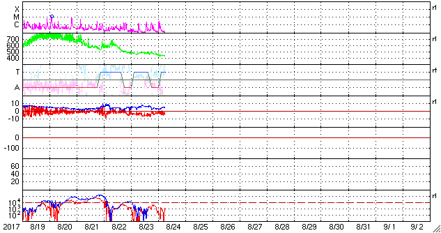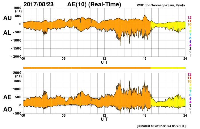世界時8月23日のAE指数(速報値)。