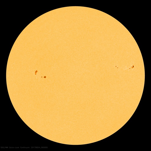 SDO衛星による太陽の可視光写真。マウスの矢印を写真に重ねると、黒点番号付きの写真に切り替わります。