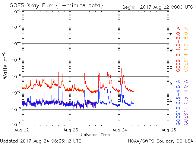- 2017/ 8/21 14:05 Cクラスフレアの発生が続いています。高速太陽風の速度は下がり始めています。