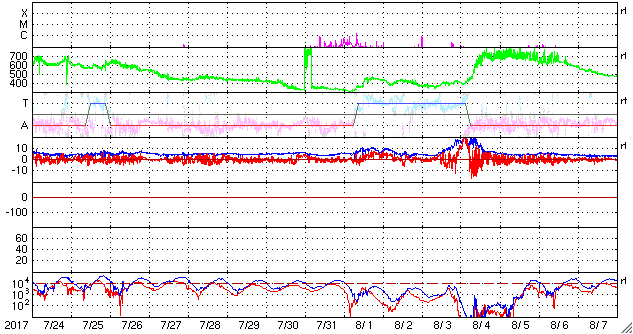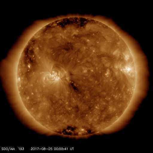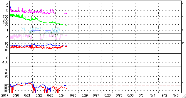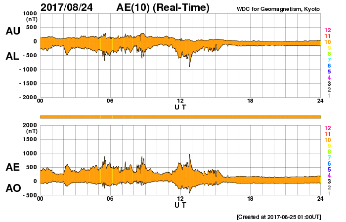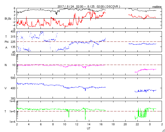 2017/ 8/25 10:11 更新 太陽風はやや低速になっています。太陽のフレアは静かになっています。 担当 篠原 太陽風の速度は、400km/秒台を割って、 370km/秒に下がり、やや低速の風に変わっています。 磁場強度は、5nTと平均的な状態です。 磁場の南北成分は、南寄りから北寄りへ切り替わっています。 このため、磁気圏の活動も穏やかになって、 AE指数のグラフは、 前半は500nT前後の活動が続いていますが、 後半は静かになっています。 SDO衛星AIA193の太陽写真では、 太陽の中心部には小さいコロナホールが見える程度です。 太陽風はしばらく穏やかな風になりそうです。 一方、東端の北半球側には、 広いコロナホールの姿が見え始めています。 これからどの様な姿を現すでしょうか。 太陽は、昨日のニュース以降、Cクラスに達するフレアの発生はなく、 X線グラフの変化そのものも見られなくなっています。 2671群は、太陽の西の端に近付いていて、 これから見えなくなっていきそうです。 ソルトレイクシティで、最後の夜を迎えています。 明日の早朝に飛行機に乗り、日本時間の明日の午前中に帰国して、 最終便で鹿児島へたどり着く予定です。 次の更新は成田から羽田へ移動する車内になりそうです。