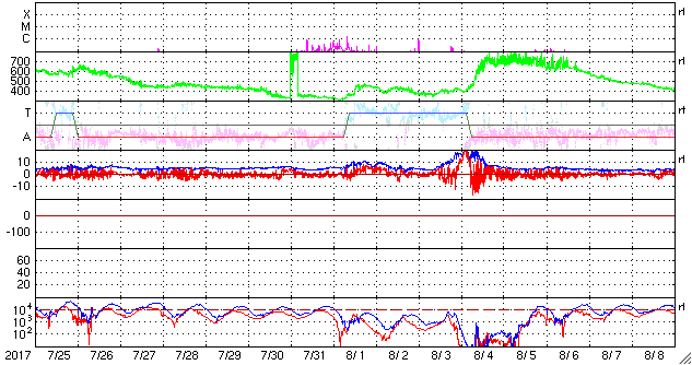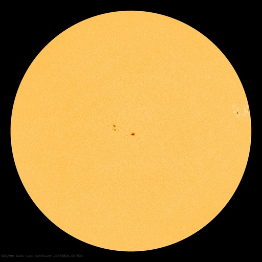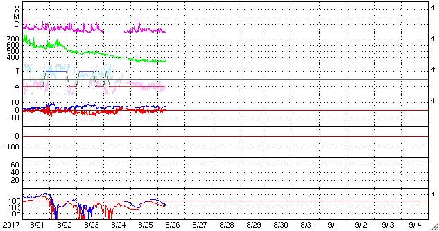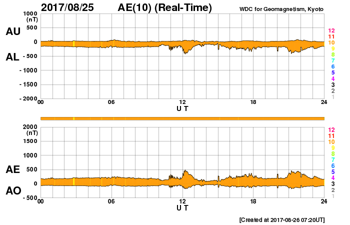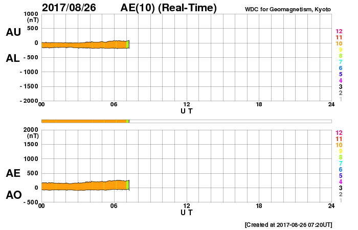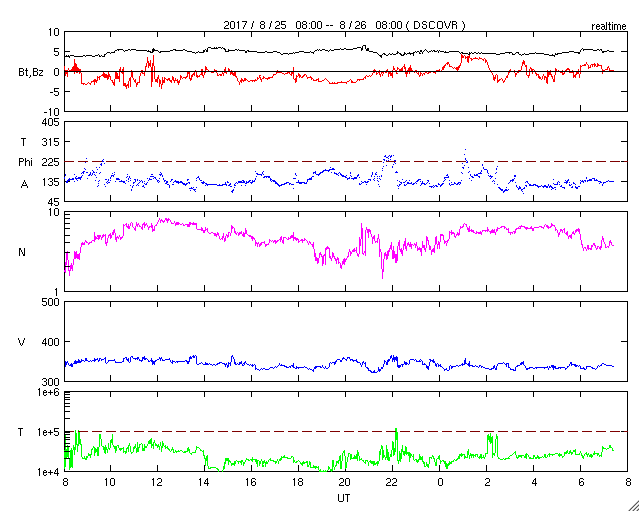 (c) 篠原 学 ![]() ブラインドに空いた一列の穴によって一列に投影された欠けた太陽。 (c) 篠原 学 ![]() 世界時8月25日のAE指数(速報値)。 (c) 京都大学WDC ![]() 世界時8月26日のAE指数(速報値)。 (c) 京都大学WDC ![]() SDO衛星のAIA193カメラによる太陽コロナの様子 (c) SDO (NASA) ![]() SDO衛星による太陽の可視光写真。マウスの矢印を写真に重ねると、黒点番号付きの写真に切り替わります。 (c) SDO (NASA) ![]() DSCOVRが観測した太陽風の磁場(1番上の枠、黒線は全体の強度、赤線は南北成分) および、太陽風の密度(3番目の紫線)、速度(4番目の青線) (c) データ:NOAA/SWPC、作図:宇宙天気ニュース ![]() 27日の太陽周期に合わせたデータプロット 太陽が同じ面を地球に向けていた27日前の変化から、今後を予想することができます。 (c) 作図:宇宙天気ニュース