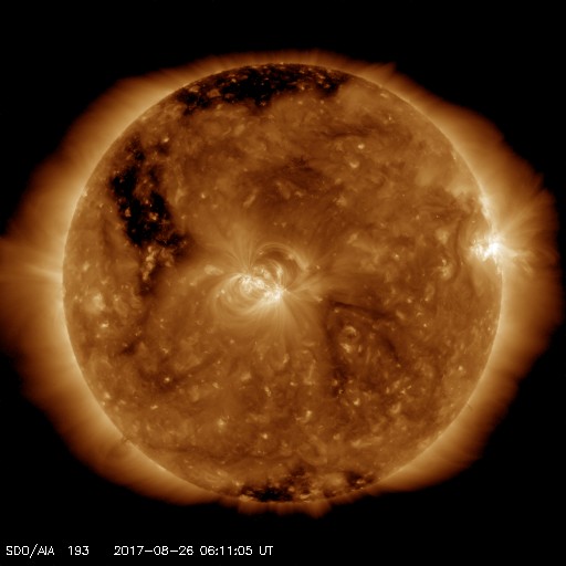 2017/ 8/26 16:31 更新 太陽風は低速です。21日の皆既日食の写真その2をどうぞ。 担当 篠原 23日に続いて、皆既日食の写真を紹介します。 1枚目は、皆既中に地球照によって見えた月面の模様です。 皆既の間、地球から見える月面は、全てが太陽の影に入って暗くなります。 しかし、地球の昼側から反射される太陽の光を受けて、 うっすら明るく照らされています。 これを地球照といいます。 皆既の間に露出を長めにすると、コロナは白く飛んでしまいますが、 地球照を捉えることができます。 写真の左に見える明るい星は、しし座のレグルスです。 地球照は、三日月前後の細い月の頃に見ることができる現象です。 しかし、月全体が地球照で照らされる「満地球照(?)」 が見えるのは、 皆既日食の時だけです。 2枚目は、ホテルのブラインドの穴が作った、部分食の太陽の列です。 紙などに小さい穴を空けて、太陽にかざすと、 穴がピンホールカメラの役割をして、太陽の姿を床に投影します。 普段は、丸い太陽がそのまま丸い姿で映るため、意識することはありませんが、 部分食の太陽に穴をかざすと、欠けた太陽の姿が投影されるのです。 このため、日食の時は予め穴を空けた紙を用意したり、 木陰に行って、木漏れ日が作る太陽の姿を見たりするのですが、 今回、ホテルの部屋のブラインドに空いた一列の穴が、 部屋の床に見事に欠けた太陽の列を作っていました。 穴の大きさと、床までの距離のバランスが良かったようで、 とても見事でした。 現在の太陽風は、速度が330km/秒まで下がり、 一段と低速の風になっています。 磁場強度は、5nTと平均的な状態で安定しています。 磁場の南北成分は、南北に小さく振れる程度で、 速度が下がっていることもあり、磁気圏の活動は全体としては穏やかで、 AE指数は、時々、400nT程度の変化が発生する程度です。 SDO衛星AIA193では、 東半球(左側)のコロナホールの姿が良く見えるようになってきました。 先頭(右端)は、2〜3日で太陽の中心線に達しそうです。 すると、その3日後、8月31日〜9月1日頃に太陽風の影響が始まりそうです。 27日周期の図を見ると、前周期は8月4日から速度の上昇が始まっています。 太陽は、2671黒点群が半分ほど隠れ、 2672群が太陽の中心に達しています。 昨日の夕方、2672群でC5.5の小規模フレアが発生しています。 再び、活動が強まるのでしょうか。 今日の昼、無事に成田空港に戻ってきました。 今夜の便で鹿児島へ飛びます。 明日からは通常の更新を、と考えていますが、 空気の乾燥と冷房の冷たさにやられました。 (日本の空気は呼吸が楽です!) しばらくダウンしているかもしれません。