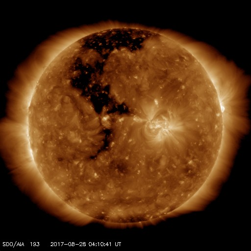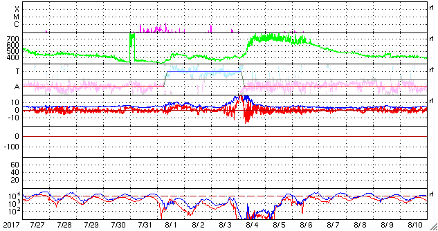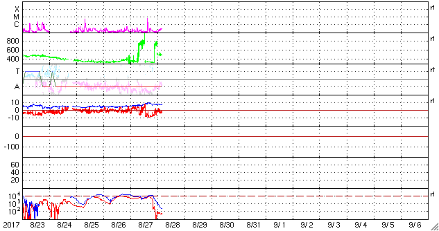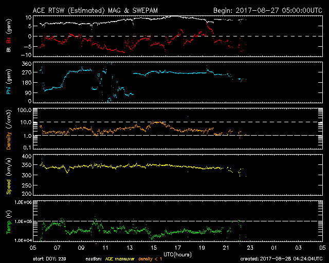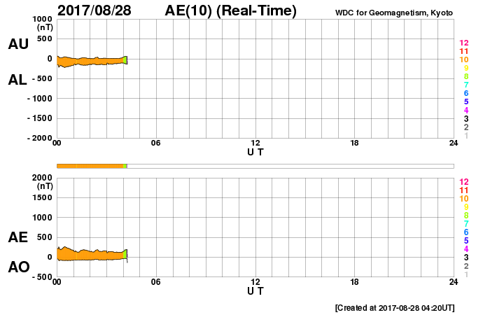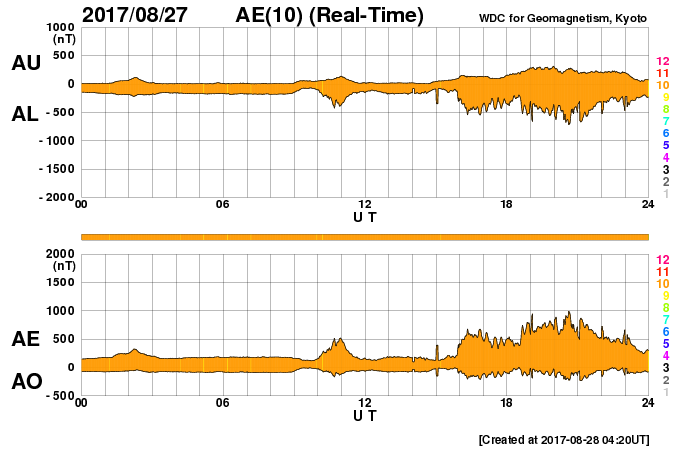 2017/ 8/28 13:24 更新 太陽風は低速の風が続いています。オレゴン州からの日食写真をどうぞ。 担当 篠原 高坂雄一さんより、8月21日の皆既日食の写真をいただきました。 オレゴン州のデトロイトという町で撮影したそうです。 (私の撮影地点からは、西へ800kmほど離れているようです) 高坂さんの滞在先では、初めは快晴だったのが、 前日の午後遅くから曇り始めたので、 これは危ないと考えて、車で観測地点を探したそうです。 レーダーを見ながら一晩中運転していたそうです。 結局、デトロイトという町の湖で撮影したとのことですが、 付近の山火事がひどく、 空は白くなり、灰も少し降ってきたほどだったそうです。 太陽がかなり赤く写ったのも、このためだそうです。 第2接触(皆既の始まり)から、光球の明るさが消えた彩層の姿、 コロナの広がり、第3接触(皆既の終わり)のダイヤモンドリングと、 美しい写真たちを4枚連続でご覧下さい。 当日晴れたのがなによりです! どうもありがとうございます。 現在の太陽風は、速度が300km/秒近くまで下がって、 かなり低速になっているようです。 DSCOVR衛星のデータがおかしくなっているため、 ACE衛星のグラフを掲載しています。 ただし、最後の部分が欠測になっているので、 今朝以降の推移は分かりません。 太陽風の磁場強度は、5nTから8nT程度に高まっています。 27日周期の図を見ると、前周期の8月1日にも、 磁場が少し強まったり、速度がやや高まる変化が到来しています。 この変化が回帰しているのかもしれません。 SDO衛星AIA193の太陽写真では、 コロナホールは太陽の中心線を越えた程度で、 この領域の影響にはまだ早いタイミングです。 磁場の南北成分は、磁場が強まった頃に、 南向きに変化が偏っています。 このため、磁気圏の活動もやや高まっていて、 AE指数では、500〜1000nTの中規模の変化が続いています。 今朝以降は、南向きの変化も少し小さくなっている様で、 AE指数の変化も目立たなくなっています。 太陽は、西に沈んでいった2671黒点群で、 C6.3の小規模フレアが発生しています。 2672群も、Bクラスの小さい変化は発生しています。 ![]() 現地8月21日に、オレゴン州デトロイトで撮影された皆既日食。 (c) 高坂雄一氏 ![]() 現地8月21日に、オレゴン州デトロイトで撮影された皆既日食。 (c) 高坂雄一氏 ![]() 現地8月21日に、オレゴン州デトロイトで撮影された皆既日食。 (c) 高坂雄一氏 ![]() 現地8月21日に、オレゴン州デトロイトで撮影された皆既日食。 (c) 高坂雄一氏 ![]() 世界時8月27日のAE指数(速報値)。 (c) 京都大学WDC ![]() 世界時8月28日のAE指数(速報値)。 (c) 京都大学WDC ![]() SDO衛星のAIA193カメラによる太陽コロナの様子 (c) SDO (NASA) ![]() SDO衛星による太陽の可視光写真。マウスの矢印を写真に重ねると、黒点番号付きの写真に切り替わります。 (c) SDO (NASA) ![]() ACEが観測した太陽風の磁場(1番上の枠、白線は全体の強度、赤線は南北成分) および、太陽風の密度(3番目の橙線)、速度(4番目の黄線) (c) NOAA/SWPC ![]() 27日の太陽周期に合わせたデータプロット 太陽が同じ面を地球に向けていた27日前の変化から、今後を予想することができます。 (c) 作図:宇宙天気ニュース