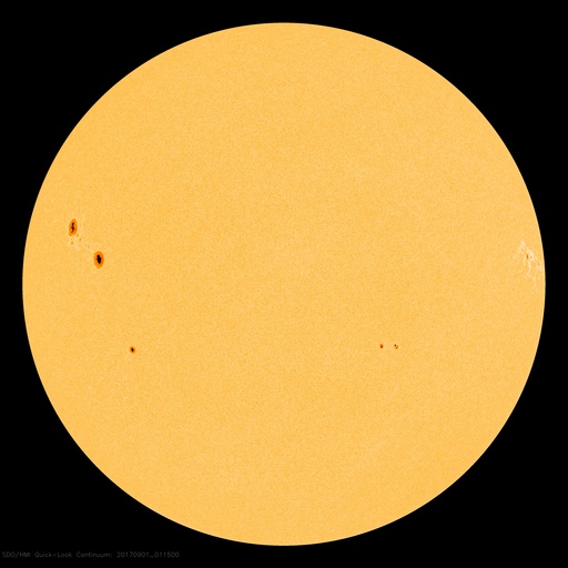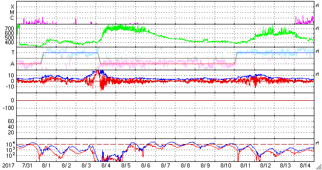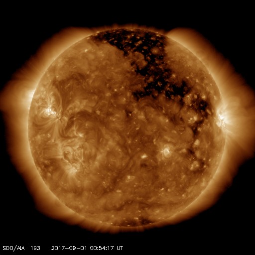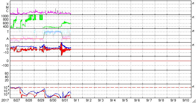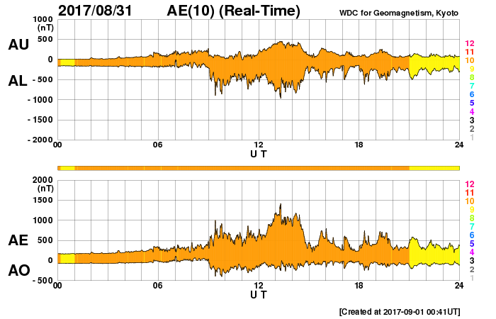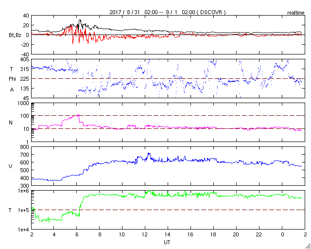 2017/ 9/ 1 10:56 更新 高速の太陽風が到来し、速度は600km/秒台に高まりました。 担当 篠原 コロナホールの影響が到来して、 昨日の昼より太陽風が強まっています。 30日13時(世界時30日4時)頃から、太陽風の磁場強度が強まり始め、 5nTと平均的だった磁場強度は、20nTを超えて強まり、 30日15時半(世界時30日6時半)には、一時的に30nTに達しました。 磁場の強まりとともに、速度も上昇を始め、 夕方、30日17時(世界時30日8時)には、 600km/秒に達しました。 以降、今朝まで600km/秒前後の高い速度が続きましたが、 現在は560km/秒と少し下がっています。 速度が高まりきった頃から、磁場強度は低下を始め、 既に、4nTまで下がっています。 太陽風磁場の南北成分は、 磁場の強まりの最初は北寄りに振れましたが、 その後、南寄りに切り替わっています。 27日周期の図を参照すると、ここでセクター境界が通過したようです。 磁気圏の活動もこの頃から強くなり、 AE指数は、500〜1200nTの活発な活動が、 6時間ほどですが発生しています。 その後は、磁場強度が下がったこともあって、 南向きの変化が小さくなり、 AE指数の変化も500nT前後と、 活発ですが規模は一段小さくなっています。 SDO衛星AIA193の太陽写真では、 コロナホールは、中緯度の領域が太陽の中央線を通り過ぎる頃です。 この辺りの影響まで地球にやって来ると考えると、 この後も4日程度は太陽風の乱れは続きそうです。 太陽では、南西部(右下)に新しく2675黒点群が発生しています。 X線グラフは、Bクラスの小さい変化が起きている程度で、 太陽は少し落ち着いています。 今日は高専スペースキャンプ2日目です。 とても良い天気に恵まれていますが、今日は屋内作業です。 缶サットやモデルロケットの講習会が行われ、 学生数名でグループを作って、缶サットの製作も行います。 明日はすぐ投下実験なので、深夜まで作業がいっぱいの予定です。 ![]() 世界時8月31日のAE指数(速報値)。 (c) 京都大学WDC ![]() SDO衛星のAIA193カメラによる太陽コロナの様子 (c) SDO (NASA) ![]() SDO衛星による太陽の可視光写真。マウスの矢印を写真に重ねると、黒点番号付きの写真に切り替わります。 (c) SDO (NASA) ![]() DSCOVRが観測した太陽風の磁場(1番上の枠、黒線は全体の強度、赤線は南北成分) および、太陽風の密度(3番目の紫線)、速度(4番目の青線) (c) データ:NOAA/SWPC、作図:宇宙天気ニュース ![]() 27日の太陽周期に合わせたデータプロット 太陽が同じ面を地球に向けていた27日前の変化から、今後を予想することができます。 (c) 作図:宇宙天気ニュース