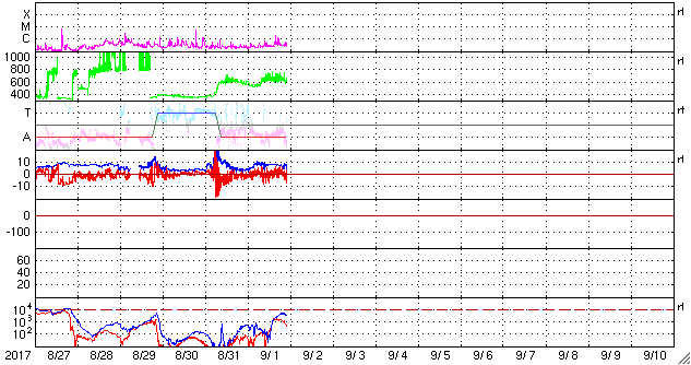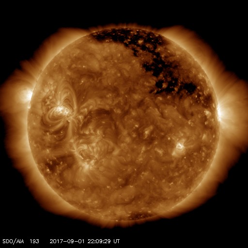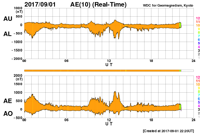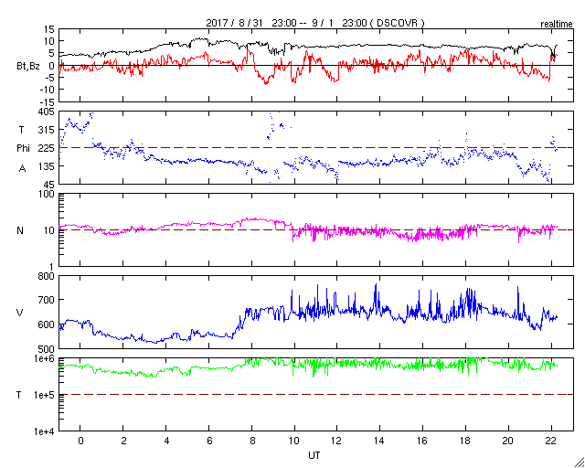 2017/ 9/ 2 07:24 更新 太陽風の速度は650km/秒へ高まっています。 担当 篠原 太陽風の速度は、昨日のニュースの後、 540km/秒程度に下がっていましたが、 夕方から再び高まって、 650km/秒と昨日よりも一段高い速度に上がっています。 磁場強度も、昨日の午後に5nTから8nTに高まり、 現在もその状態です。 引き続き、速度の変化にも注目してください。 太陽風磁場の南北成分は、 0nTを挟んで北に振れたり、南に振れたりしています。 速度が高まっているため、磁場が南向きに振れると、 磁気圏の活動も高まって、 AE指数は、1000nTや700nTの変化が発生しています。 連続的な変化ではありませんが、 極域ではにぎやかなオーロラの輝きが見られたのではないでしょうか。 SDO衛星AIA193では、 今回の高速太陽風をもたらしたコロナホールは、 太陽の西に進んでいます。 もう3日程経つと、地球への影響は終わるかもしれません。 一方、太陽の東側にはコロナホールは見えません。 高速風の通過後、太陽風はしばらく穏やかになりそうです。 太陽では、2672黒点群が西の端に沈んで見えなくなっています。 大きな姿を見せている2674黒点群では、 今日の未明に、C2.0、C1.2の小規模フレアが発生しています。 しかし、特に活動が高まっているという様子ではありません。 また、東端から活動的な領域が近づいている様です。 高専スペースキャンプは、今日は外へ出て、 缶サットの投下実験や、 講座で製作したモデルロケットの打ち上げを行います。 学生たちは、それぞれ工夫を凝らした缶サットの製作を大急ぎで進めていて、 そのまま徹夜になってしまったチームもあるようです。 どんな缶サットができあがったのか、投下するのが楽しみです。 今日は、この後ずっと外の作業になりそうなので、 朝の更新になりました。 大会は明日までです。 ![]() 世界時9月1日のAE指数(速報値)。 (c) 京都大学WDC ![]() SDO衛星のAIA193カメラによる太陽コロナの様子 (c) SDO (NASA) ![]() SDO衛星による太陽の可視光写真。マウスの矢印を写真に重ねると、黒点番号付きの写真に切り替わります。 (c) SDO (NASA) ![]() DSCOVRが観測した太陽風の磁場(1番上の枠、黒線は全体の強度、赤線は南北成分) および、太陽風の密度(3番目の紫線)、速度(4番目の青線) (c) データ:NOAA/SWPC、作図:宇宙天気ニュース ![]() 27日の太陽周期に合わせたデータプロット 太陽が同じ面を地球に向けていた27日前の変化から、今後を予想することができます。 (c) 作図:宇宙天気ニュース
