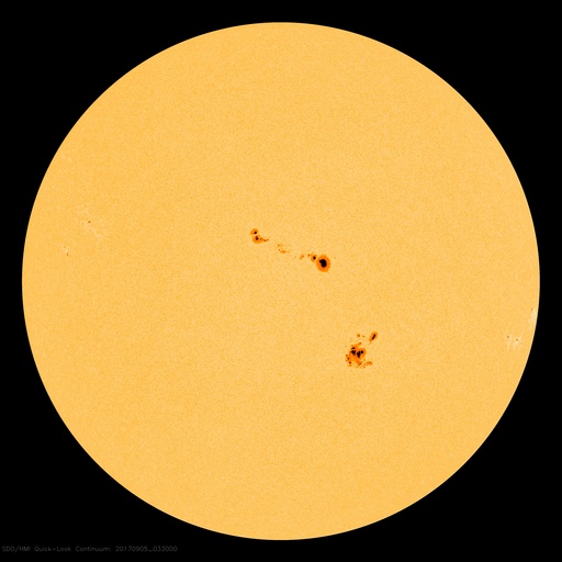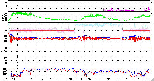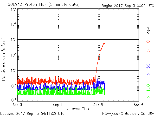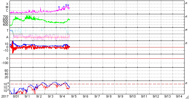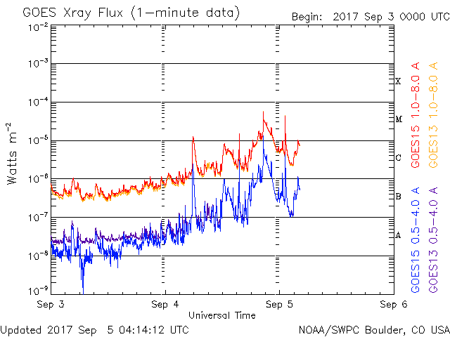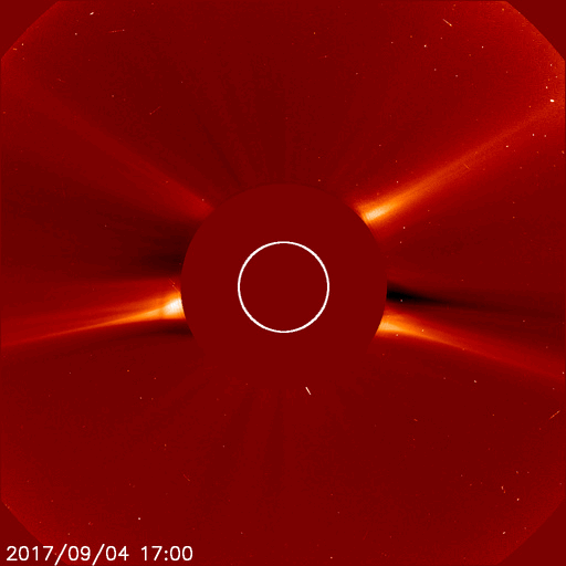 2017/ 9/ 5 13:11 更新 2673群でMクラスのフレアが続いています。CMEも発生しています。 担当 篠原 昨日のニュース以降、2673黒点群の活動が激しくなり、 これまでに、Mクラスの中規模フレアを9回起こしています。 最初のMフレアは、昨日の昼過ぎ、 4日14時半(世界時4日5時半)のM1.2でした。 深夜になると、M1.5、M1.0、M1.7、M1.5と M1のフレアを次々と起こし、 今朝、5日5時半(世界時4日20時半)には、M5.5と、 今回の活動で最大の規模のフレアが発生しました。 M5に達する規模のフレアの発生は、 4月3日のM5.8以来で、5か月ぶりです。 残念なことに、SDO衛星のAIAカメラの画像の更新がなく、 フレアの様子を見ることができません。 GOES衛星のX線写真で、M5.5フレア直前までの動画を掲載します。 これらのフレアに伴って、CME(太陽ガスの放出現象)も発生しています。 SOHO衛星LASCO C2、C3の動画を掲載します。 これを見ると、前のフレアでCMEが飛び出し始めたところに、 M5.5のCMEが、追いかけるように勢い良く飛び出しているようです。 下半分を中心に、太陽を丸く囲むようにガスが飛び出しているので、 太陽風の乱れは地球へも到来すると思われます。 発生から2〜3日後に地球に達すると考えると、 9月7〜8日頃になりそうです。 太陽風の磁場が南向きに強く変化すると、 激しい磁気圏の乱れをもたらす可能性があります。 2673群の活動はその後も続き、 M2.1、M4.2、M1.0とMクラスのフレアを起こし続けています。 引き続き2673群の活動に注目してください。 また、太陽活動の高まりにより、 太陽放射線(非常に高速の陽子)も増加しています。 GOES衛星の観測では、およそ60に達してます。 太陽風は、再び速度が高まっています。 昨日は、480km/秒とやや高速程度に下がりかけていたのですが、 今日に入るとゆっくりと高まって、 現在は580km/秒に達しています。 太陽風の磁場強度も、 速度の増加とともに8nTに高まる変化が発生しています。 南北成分も南寄りに変化したため、磁気圏の活動は高まり、 AE指数は、500〜1000nTの中規模の変化が連続的に発生しています。 現在は、磁場強度は5nTに下がり、 太陽風の高まりも一段落となりそうです。