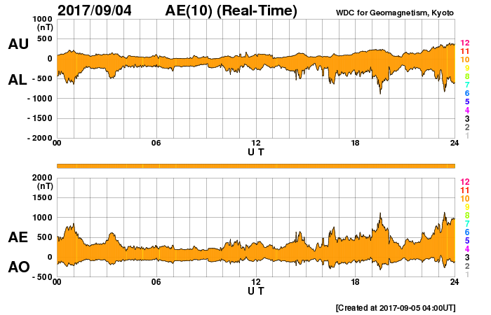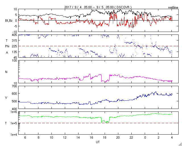 (c) NOAA/SWPC ![]() M5.5のフレアに伴って発生したCMEの様子。SOHO衛星LASCO C2、C3。 (c) SOHO (ESA & NASA) ![]() この1日間の1673黒点群の変化。SDO衛星。 (c) SDO (NASA)、(動画加工 : 宇宙天気ニュース) ![]() 世界時9月4日のAE指数(速報値)。 (c) 京都大学WDC ![]() 世界時9月5日のAE指数(速報値)。 (c) 京都大学WDC ![]() SOHO衛星のEIT195カメラによる太陽コロナの様子 (c) SOHO (ESA & NASA) ![]() SDO衛星による太陽の可視光写真。マウスの矢印を写真に重ねると、黒点番号付きの写真に切り替わります。 (c) SDO (NASA) ![]() GOES衛星の太陽X線データ (c) NOAA/SWPC ![]() GOES衛星の太陽放射線データ (c) NOAA/SWPC ![]() DSCOVRが観測した太陽風の磁場(1番上の枠、黒線は全体の強度、赤線は南北成分) および、太陽風の密度(3番目の紫線)、速度(4番目の青線) (c) データ:NOAA/SWPC、作図:宇宙天気ニュース ![]() 27日の太陽周期に合わせたデータプロット 太陽が同じ面を地球に向けていた27日前の変化から、今後を予想することができます。 (c) 作図:宇宙天気ニュース