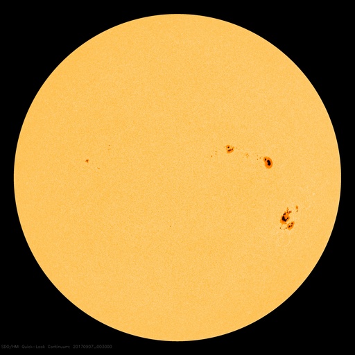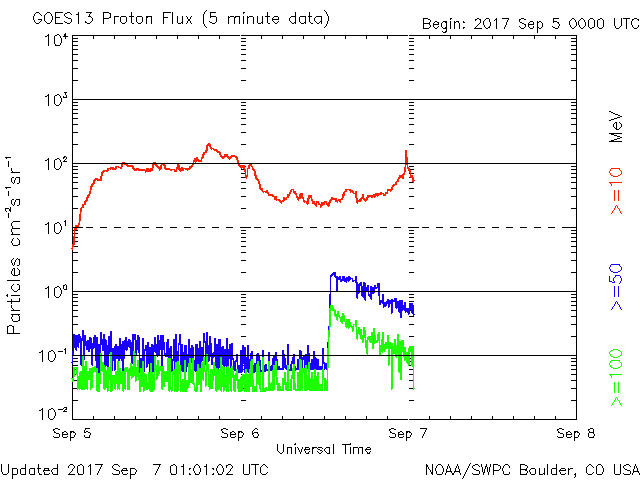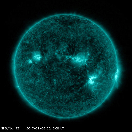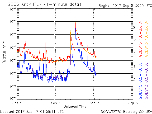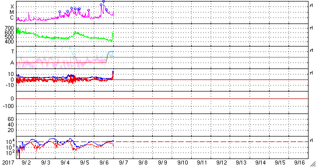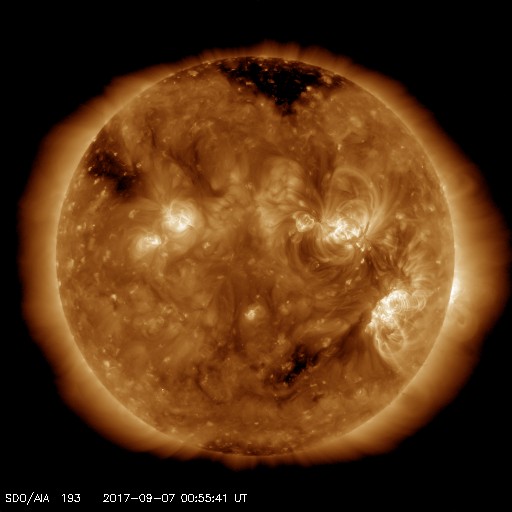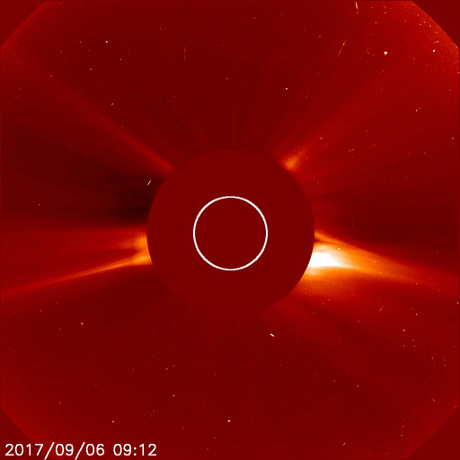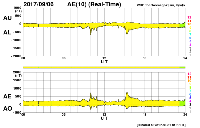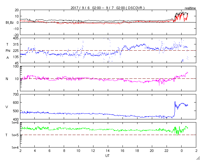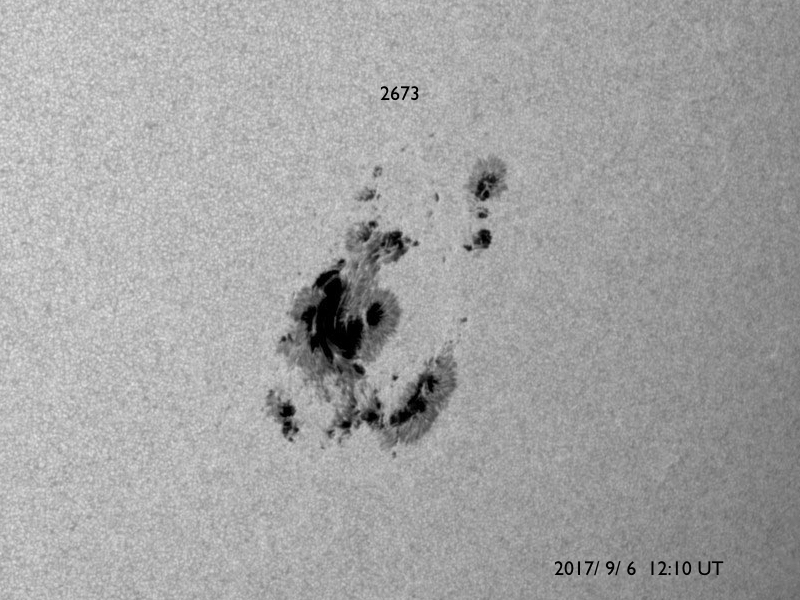 2017/ 9/ 7 10:06 更新 X2.2、X9.3の大規模フレアが発生しました。X9のフレアは11年ぶりです。 担当 篠原 昨日の夕方、6日18時(世界時6日9時)に、 太陽の南西(右下)の2673黒点群で、 X2.2の大規模フレアが発生しました。 Xクラスのフレアの発生は、 2015年5月5日のX2.7以来、2年4か月ぶりのことで、 このフレアだけでも驚いたのですが、 直後の6日21時(世界時6日12時)になると、 更に激しいX9.3の大規模フレアが発生したのです。 X9に達するフレアは、 2006年12月5日のX9.0以来で、11年ぶりのことです。 2006年は、まだ前の活動周期である第23期の後半です。 従って、今回のフレアは現在の第24期最大規模のフレアになります。 (これまでの最大は、2011年8月9日のX6.9でした) X2.2、X9.3フレアの様子を、 SDO衛星AIA131、193の動画で紹介します。 AIA131では爆発の激しさが強調されて見え、 AIA193はフレアの後のプロミネンスの様子が綺麗に見えて、 組み合わせると、動画としては良いバランスに感じます。 また、X9.3フレアに伴って、 CME(太陽ガスの放出現象)も飛び出しています。 SOHO衛星LAACOC2、C3の動画を掲載します。 2673黒点群は、既に太陽の西側に半分ほど進んでいるため、 CMEの噴出の中心は、太陽の右側に偏っています。 それでも、ガスは太陽全体を囲むように広がっていて、 噴出は地球の方向にも向かっているようです。 フレアの激しさから考えて、 地球まで2日くらいかかると考えると、 太陽風の乱れの到来は、明日、8日の夜前後となりそうです。 現在の太陽風には、既にひとつ前のCMEの乱れが始まっています。 次の乱れがいつやって来るか、注目してください。 X9.3の後も、2673群は、M2.5、M1.4、M1.2と、 中規模フレアを起こしています。 この後の活動はどうなるでしょうか。 今回のフレアにより、太陽放射線は再び100に達しています。 ただし、よりエネルギーの高い粒子の変化を示す、 緑色線(100MeV以上)や青色線(50MeV以上)は、 X9フレアに関係して急な増加を示しています。 太陽風も乱れが始まっています。 今朝、7日8時(世界時6日23時)に、 太陽風の速度は420km/秒から600km/秒へ、 磁場強度は、3nTから15nTへ急に強まる変化が到来しています。 5日の朝に発生したM5.5のフレアに伴って発生した CMEによる乱れです。 注目の太陽風磁場の南北成分は、 最初は北向きに強まりました。 10nTを超えるくらいに強まっているのですが、 北向きでは磁気圏への影響は小さく、 今のところAE指数は特に変化は見られません。 CMEによる磁場の乱れでは、 時間とともに方向が大きく切り替わる傾向があります。 今後、南北成分が大きく南向きに変化した場合は、 太陽風の速度も高まっているため、 磁気圏の乱れも一気に激しくなるでしょう。 この後の太陽風の変化に注目してください。 また、明日の夜くらいには、 X9フレアに伴うCMEの乱れが到来する可能性があります。 明日の午後以降は、次の変化に注目してください。 ![]() X2.2、X9.3の大規模フレアの様子。SDO衛星AIA131、AIA193。 (c) SDO (NASA)、(動画加工 : 宇宙天気ニュース) ![]() X9.3のフレアに伴って発生したCME。SOHO衛星LASCO C2、C3。 (c) SOHO (ESA & NASA)、 (動画加工 : 宇宙天気ニュース) ![]() 2673黒点群の拡大写真。SDO衛星。 (c) SDO (NASA)、作図:宇宙天気ニュース ![]() 世界時9月6日のAE指数(速報値)。 (c) 京都大学WDC ![]() SDO衛星のAIA193カメラによる太陽コロナの様子 (c) SDO (NASA) ![]() SDO衛星による太陽の可視光写真。マウスの矢印を写真に重ねると、黒点番号付きの写真に切り替わります。 (c) SDO (NASA) ![]() GOES衛星の太陽X線データ (c) NOAA/SWPC ![]() GOES衛星の太陽放射線データ (c) NOAA/SWPC ![]() DSCOVRが観測した太陽風の磁場(1番上の枠、黒線は全体の強度、赤線は南北成分) および、太陽風の密度(3番目の紫線)、速度(4番目の青線) (c) データ:NOAA/SWPC、作図:宇宙天気ニュース ![]() 27日の太陽周期に合わせたデータプロット 太陽が同じ面を地球に向けていた27日前の変化から、今後を予想することができます。 (c) 作図:宇宙天気ニュース