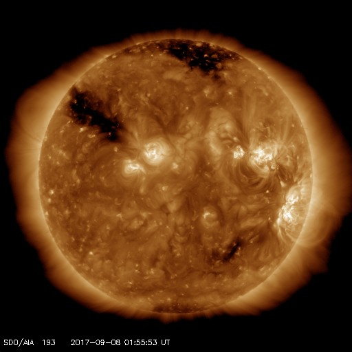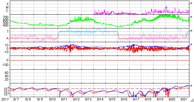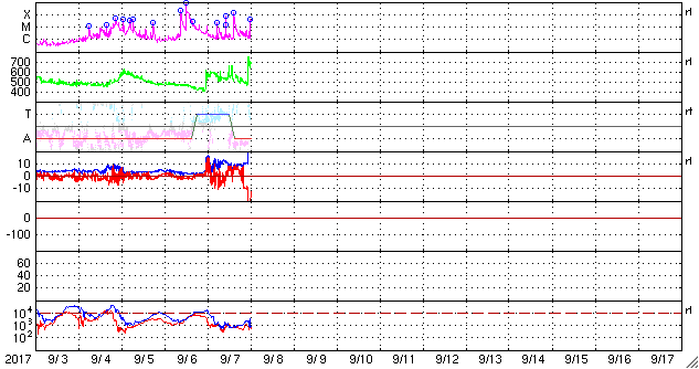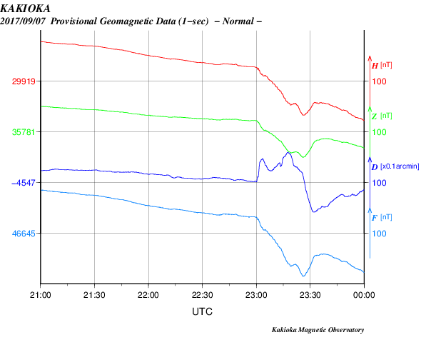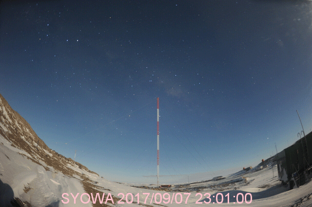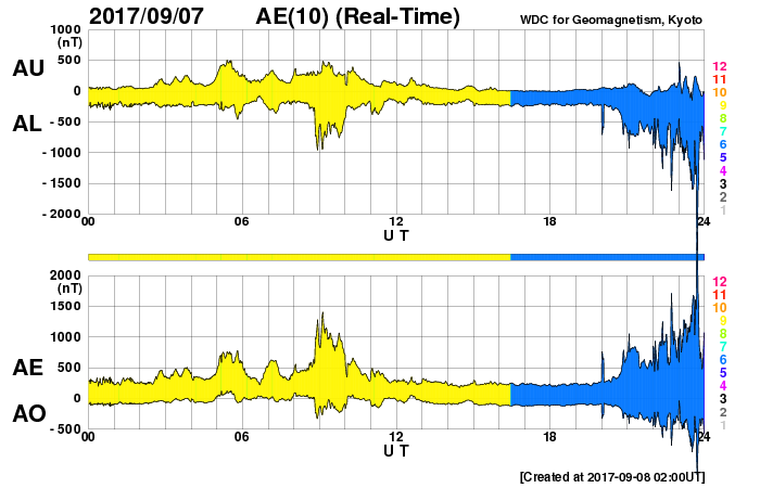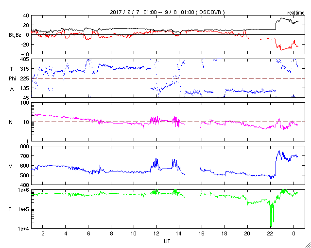 2017/ 9/ 8 11:00 更新 次のCMEによる太陽風の乱れが到来しました。磁気圏の活動も激しくなっています。ニュージーランドのオーロラをどうぞ。 担当 篠原 今朝、X9.3のフレアに伴って飛び出したCMEによる太陽風の乱れが、 地球に到来しました。 DSCOVR衛星の太陽風観測では、8日7時半(世界時7日22時半)に、 速度が500km/秒から700km/秒へ急に上昇し、 磁場強度も、10nTからおよそ30nTへ強まっています。 乱れが地球に到達したのは、およそ30分後で、 気象庁地磁気観測所(茨城県)の地磁気データでは(1枚目の図)、 8日8時(世界時7日23時)に、磁場の急な変化が発生しています。 X9.3フレアの発生から1日半での到達となり、 予想よりもかなり早い到来となりました。 その割に、太陽風の最高速度は750km/秒に留まっていて、 特に激しいというほどではありません。 太陽風磁場の南北成分は、 昨日の朝以降、北向きに振れる時間帯が長く、 磁気圏の乱れは限定的でした。 しかし、今朝早く、8日5時(世界時7日20時)から南向きに傾向が変わり、 -10nTの強い南向きが連続するようになりました。 このため、磁気圏の活動は高まって、 AE指数は1000nT規模の変化に発達していました。 この直後に次のCMEが到来して磁場が強まったのですが、 南北成分は更に南向きに強まり、-30nTに達する大きな振れ幅になりました。 速度が700km/秒に高まったことも重なって、 磁気圏の活動は更に激しくなり、 AE指数は、1500〜2000nTに達する変化を記録しています。 この頃の南極昭和基地のオーロラの様子を動画で紹介します。 満月直後の大きな月が空を明るく照らしていますが、 それに負けずに明るくオーロラが輝いています。 京都大学WDCのDst指数(速報値)では、 -190nTに達する減少(Dst指数はマイナス方向に強まります)が発生していて、 大きな磁気嵐になっています。 Dst指数が-200nTまで変化すると、2015年6月以来の記録になります。 また、昨日の朝に到来した太陽風の乱れによるオーロラの速報を、 ニュージーランドの中村太一さんが送って下さいました。 現地7日20時55分(世界時7日8時55分)の2枚と、 現地7日22時40分(世界時7日10時40分)の撮影です。 AE指数のグラフを見ると、 世界時7日9時に1300nTの大きな変化が発生しています。 最初の2枚はこの活動を捉えたようです。 中村さんによると、昨日は昼から雨雲が南島各地を覆っていたそうですが、 ダニーデンでは20時頃から晴れ間が広がって来たそうです。 しかし、月が大きいため空は非常に明るかったそうで、 オーロラがあることは認識できたそうですが、 その動きはカメラでのみ確認が可能な状態だったそうです。 3枚目は特に、縦筋のオーロラが並ぶピケットフェンスがよく見えています。 この後、オーロラは特に特徴を見せずに月夜と混ざって、 朝にかけて確認することも難しくなっていったそうです。 AE指数もこの後は変化がなくなっています。 貴重な速報をどうもありがとうございます。 現在の太陽風は、速度は700km/秒、磁場強度は25nTと強まっています。 南北成分は、依然、-20nT前後と大きく南向きに振れています。 磁気圏の活動は激しく続いているようで、 AE指数は最新のデータでも、1000nTに達する値を記録しています。 CMEによる太陽風の乱れは、強まった状態が続いています。 引き続き注目してください。 太陽では、昨夜、7日23時半(世界時7日14時半)に、 X1.3の大規模フレアが発生しています。 その他にも、M2.4、M1.4、M7.3、M3.9の中規模フレアなどを起こしています。 2673群は次第に西の端に近づいていますが、 この後の活動も注目してください。 太陽放射線(非常に高速の陽子)は、800に達する変化になっています。 ここまで高まったのは、2015年6月22日以来です。 今朝はイベントたっぷりで、非常に長文になってしまいました。 書くのに1時間半かかりました。