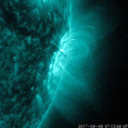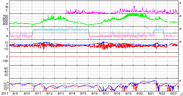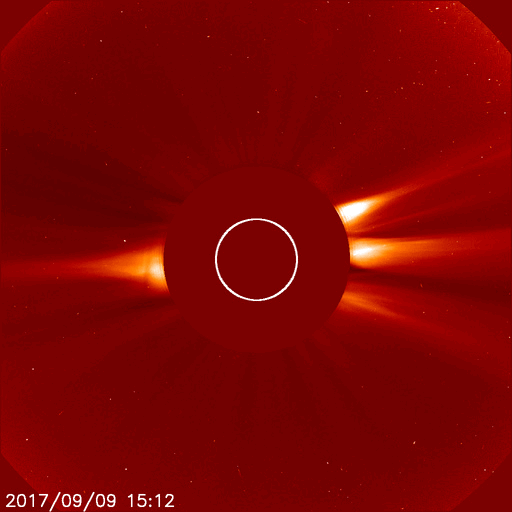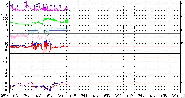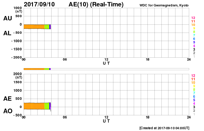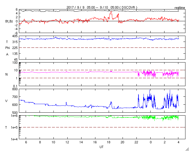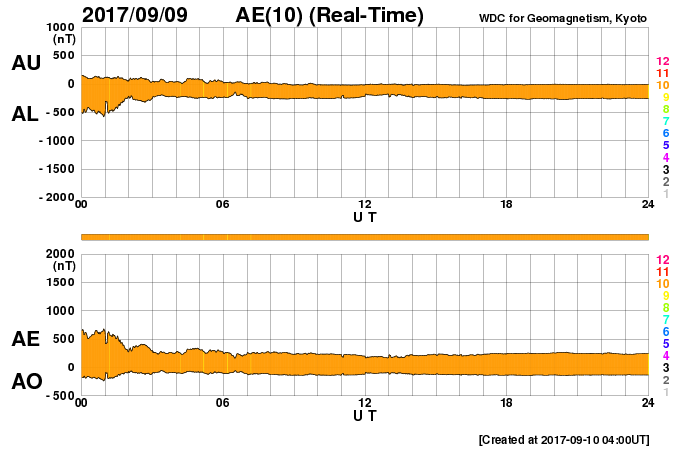 (c) 小貝哲夫氏 ![]() 2673黒点群で続いているフレアの様子。SDO衛星AIA131。 (c) SDO (NASA)、(動画加工 : 宇宙天気ニュース) ![]() 太陽の右に向かって噴出しているCME。SOHO衛星LASCO C2、C3。 (c) SOHO (ESA & NASA)、 (動画加工 : 宇宙天気ニュース) ![]() Dst指数(速報値)は、最大で -154nT の変化になり、ゆっくりと回復に向かっています。 (c) 京都大学WDC ![]() 世界時9月9日のAE指数(速報値)。 (c) 京都大学WDC ![]() 世界時9月10日のAE指数(速報値)。 (c) 京都大学WDC ![]() SDO衛星のAIA193カメラによる太陽コロナの様子 (c) SDO (NASA) ![]() SDO衛星による太陽の可視光写真。マウスの矢印を写真に重ねると、黒点番号付きの写真に切り替わります。 (c) SDO (NASA) ![]() DSCOVRが観測した太陽風の磁場(1番上の枠、黒線は全体の強度、赤線は南北成分) および、太陽風の密度(3番目の紫線)、速度(4番目の青線) (c) データ:NOAA/SWPC、作図:宇宙天気ニュース ![]() ACEが観測した太陽風の磁場(1番上の枠、白線は全体の強度、赤線は南北成分) および、太陽風の密度(3番目の橙線)、速度(4番目の黄線) (c) NOAA/SWPC ![]() 27日の太陽周期に合わせたデータプロット 太陽が同じ面を地球に向けていた27日前の変化から、今後を予想することができます。 (c) 作図:宇宙天気ニュース