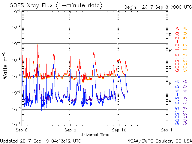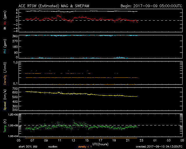 2017/ 9/10 13:13 更新 2673黒点群は太陽の西に沈みかけています。カナダ・ドーソンシティのオーロラをどうぞ。 担当 篠原 小貝哲夫さんより、 カナダ・ユーコン準州のドーソンシティで、 現地8日5時20分(世界時8日12時20分)に撮影された オーロラの写真をいただきました。 昨日のニュースで紹介した、 太陽風磁場の強い南向きが到来した直後のオーロラです。 小貝さんによると、この夜は、0時から粘っていたそうですが、 諦めかけた5時過ぎに、今まで見たこともない光が街の上空で炸裂したそうで、 月明かり、街灯りにビクともしないオーロラだったそうです。 昨日掲載したAE指数のグラフを見ると、 2000nTの枠を超えて激しく変化した瞬間の撮影です。 さぞ素晴らしい光景だったのでしょう。 この時間までは、太陽風の磁場の方向が北向きで、 AE指数はほとんど変化しない状態が続いていました。 その中を、明け方近くまで観測を続けた成果だと思います。 貴重な観測記録をどうもありがとうございます。 現在の太陽風は、速度が650km/秒から550km/秒へ下がっています。 ただし、DSCOVR衛星のデータに乱れが発生していて、 最新の情報が分かりません。 ACE衛星のデータを参照すると、 今朝の段階で500km/秒まで下がっているようですが、 こちらも、その後はリアルタイムデータの取得がなく、 現在の状況は不明です。 太陽風の磁場強度は、5nTと平均的な値で安定しています。 南北成分は、0nTから弱い北寄りになっています。 このため、磁気圏は穏やかな状態で、 オーロラの活動度を示すAE指数のグラフは、 目立った変化は見られません。 (全体が太くなっているのは元データの問題です) CMEによる太陽風の乱れは、ほぼ終わりつつあります。 速度が400km/秒台へ下がっていくのを見届けて下さい。 一方、SDO衛星AIA193の太陽コロナ写真を見ると、 北半球の中低緯度域にコロナホールが大きく広がっています。 先頭(右端)は、太陽の中心線に達しています。 3日後くらいから、こちらの影響で太陽風が高まりそうです。 太陽では、2673黒点群のフレアが続いています。 昨日のニュース以降も、 M1.1、M3.7、M1.1と中規模フレアが3回、 C4.2、C4.7、C9.0など、小規模フレアを9回起こしています。 活発な活動の様子を、SDO衛星AIA131の動画で紹介します。 また、これらのフレア活動に伴って、 CME(太陽ガスの放出現象)も発生しています。 太陽の右に向かって噴き出しているので、地球への影響はないでしょう。 2673黒点群は、太陽の西の端に達して、沈みかけています。 にぎやかだった太陽も、この後は静かになるでしょう。 今回の太陽風の乱れを受けて、 放射線帯の高エネルギー電子が増加して、 GOES15(青線)で10,000に達しています。