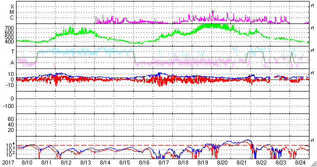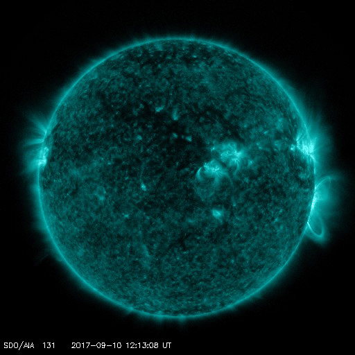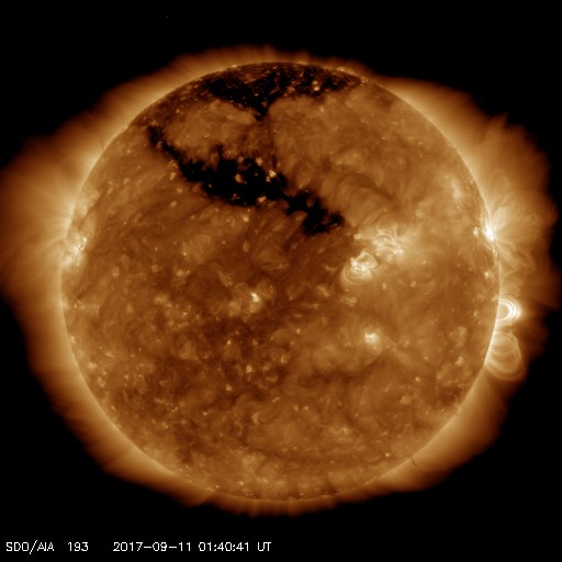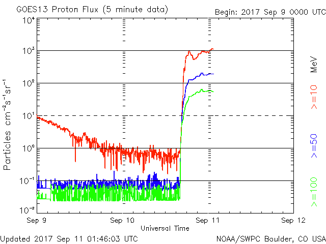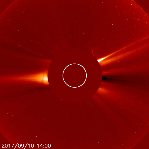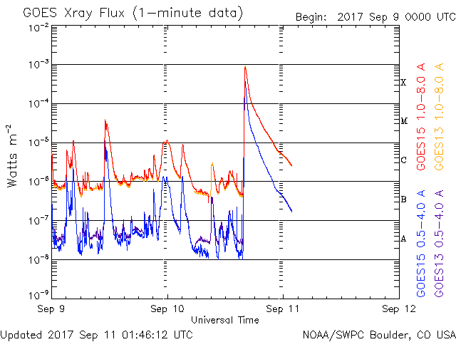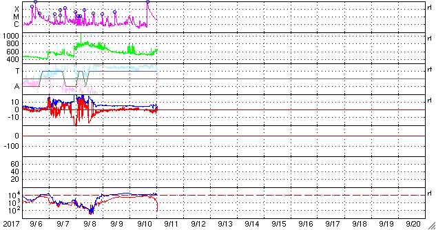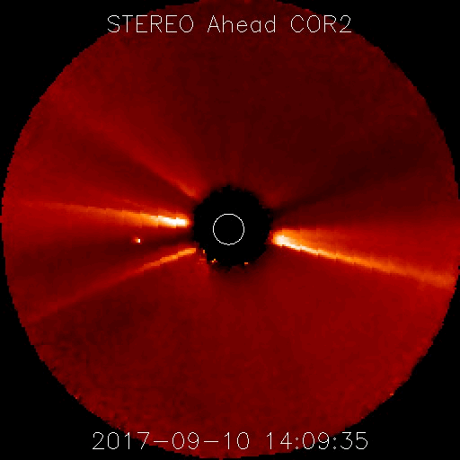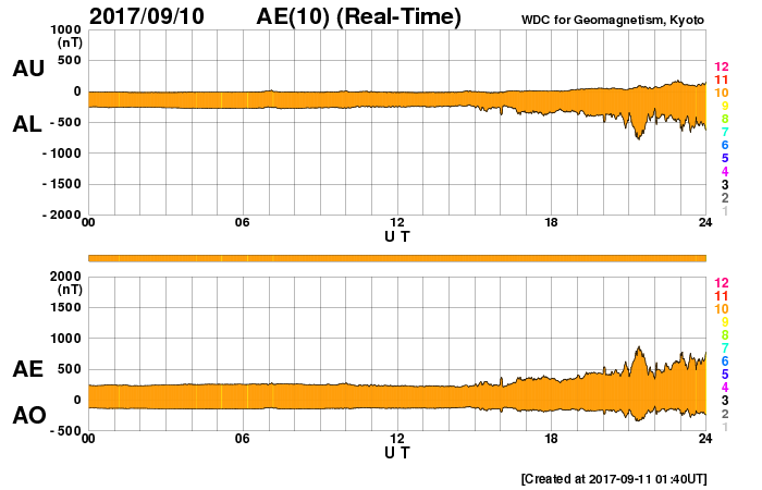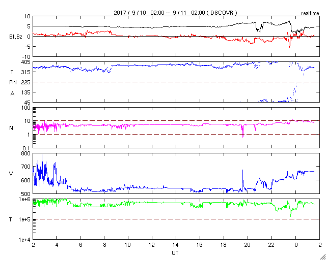 2017/ 9/11 10:46 更新 太陽の西に沈んだ2673黒点群で、X8.2の大規模フレアが発生しました。 担当 篠原 深夜、11日0時半(世界時10日15時半)に、 太陽の西に沈んでいった2673黒点群で、 X8.2の大規模フレアが発生しました。 SDO衛星AIA131、193による動画を掲載します。 可視光写真では、2673黒点群は既に見えなくなっていて (昨日の昼頃までは、太陽の端にかろうじて見えていました)、 掲載の動画でも、明るく輝くポスト・フレアループの根元は、 地平線(?)の向こう側に行っている様に見えます。 GOES衛星のX線データでは、 6日に発生したX9.3に次ぐ規模のフレアになっていますが、 発生領域が太陽のこちら側にあれば、 もう一段高い規模のフレアとして観測されたかもしれません。 いずれにしても、太陽の第24活動周期の 第一位、第二位の規模のフレアが、 この一週間に連続して発生したことになります。 このフレアに伴って、CME(太陽ガスの放出現象)も発生しています。 SOHO衛星LASCO C2、C3と、 太陽の向こう側から観測しているSTEREO Ahead衛星のCOR2 による動画を掲載します。 6日に発生したCMEの動画と見比べて見て下さい。 飛び出す方向の違いもあるため、単純には比較できないと思いますが、 CMEのガスは、前回よりも勢い良く飛び出しているように感じます。 太陽の向こう側に回り込んで発生した現象なので、 地球へ影響が及ぶ可能性は一般的には低いのですが、 SOHO衛星とSTEREO衛星の動画を見ると、 今回は、地球方向へも太陽風の乱れがやって来るかもしれません。 前回のCMEの乱れは、1日半で地球までやって来ました。 同等の速度を考えると、明日の昼以降となりますが、 CMEの中心からは大きく外れているので、 太陽風の乱れがやって来ても、 変化が特別大きくなることはないと思います。 どのような結果になるか、今後の太陽風に注目してください。 太陽放射線(非常に高速の陽子)も増加して、 10MeV以上の粒子を示す赤線が、再び1000に達しています。 ただし、今回の増加では、50MeV以上を示す青線、 100MeV以上を示す緑色線のグラフも大きく増加しています。 よりエネルギーの高い陽子が、 前回よりも多く地球方向に飛来したことを示しています。 このため、SOHO衛星の画像には、 白い細かい筋が多数発生しています。 これは、観測装置のCCDに高エネルギーの陽子が衝突することで 発生しているノイズで、 snowstorm (吹雪) と呼ばれたりしています。 太陽の向こう側に消えていった2673黒点群ですが、 今後も活動を続けるかもしれません。 STEREO Ahead衛星の視界に入ってきた(太陽の左端) 様なので、引き続き注目してください。 太陽風は、今朝早くから速度が高まり始め、 660km/秒とかなり高い速度に達しています。 磁場強度は、5nTから多少増減する変化を記録していますが、 現在は5nTに戻っています。 磁気圏の活動もやや高まっているようですが、 AE指数のグラフは全体が太くなっていて、 詳しくは読み取りにくくなっています。 コロナホールの影響には早すぎると思います。 太陽風の速度上昇は、 2673群から流れ続けていたCMEに関係する変化でしょうか。 ![]() 西の端に沈んだ2673黒点群で発生したX8.2の大規模フレア。SDO衛星AIA131、193。 (c) SDO (NASA)、(動画加工 : 宇宙天気ニュース) ![]() X8.2フレアに伴って発生したCME。太陽放射線によるsnowstormも発生している。SOHO衛星LASCO C2、C3。 (c) SOHO (ESA & NASA)、 (動画加工 : 宇宙天気ニュース) ![]() STEREO Ahead衛星COR2による、太陽の向こう側から観測したCME。 (c) STEREO (NASA)、 (動画加工 : 宇宙天気ニュース) ![]() 世界時9月10日のAE指数(速報値)。 (c) 京都大学WDC ![]() SDO衛星のAIA193カメラによる太陽コロナの様子 (c) SDO (NASA) ![]() SDO衛星による太陽の可視光写真。マウスの矢印を写真に重ねると、黒点番号付きの写真に切り替わります。 (c) SDO (NASA) ![]() GOES衛星の太陽X線データ (c) NOAA/SWPC ![]() GOES衛星の太陽放射線データ (c) NOAA/SWPC ![]() DSCOVRが観測した太陽風の磁場(1番上の枠、黒線は全体の強度、赤線は南北成分) および、太陽風の密度(3番目の紫線)、速度(4番目の青線) (c) データ:NOAA/SWPC、作図:宇宙天気ニュース ![]() 27日の太陽周期に合わせたデータプロット 太陽が同じ面を地球に向けていた27日前の変化から、今後を予想することができます。 (c) 作図:宇宙天気ニュース