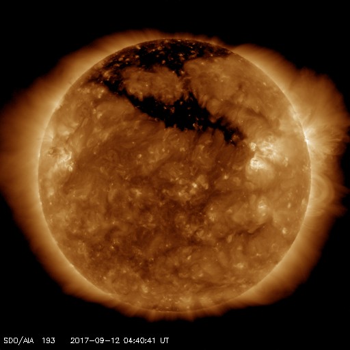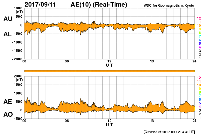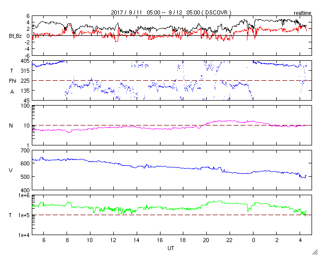 2017/ 9/12 13:50 更新 高速太陽風は続いていますが、磁気圏は比較的穏やかです。ニュージーランドのオーロラをどうぞ。 担当 篠原 ニュージーランドの中村太一さんより、 現地9日0時(世界時8日12時)に撮影された オーロラの写真をいただきました。 一昨日、10日のニュースで紹介した、 小貝さんによるカナダのオーロラ写真と全く同じ時間です。 この日は、太陽風の速度は800km/秒と高く、 磁場強度も10nT程度に強まっていましたが、 磁場の南北成分は北向きに振れていて、 磁気圏は穏やかな状態が半日近く続いていました。 そこへ、磁場の急な変化が到来して、 南向きに、-20nT近くまで強まったのです。 このため、磁気圏の活動は一気に強まって、 AE指数は2000nTを超える激しい変化が起きました。 このタイミングを、ニュージーランドで同時に捉えていたのです。 中村さんによると、オーロラの始まり方が、 いつのもジワジワと近づいて見えてくるパターンをすっぽかして、 何もなかった空に強い緑の光がはっきりと見え始め、 一気に空が明るくなったそうです。 また、動きも速かったそうで、3秒前後のシャッタースピードでも、 写真の中でオーロラの変化が分かるほどになっているとのことです。 この日のダニーデンの夕方は、曇りと雨だったので、 中村さんは、車で2時間ほど南に移動して晴れ間を見つけたそうです。 そして、太陽風のデータを見ながら、磁場が南に急変したことから、 変化の始まりを予測して待ち構えていたそうです。 カナダとニュージーランドで同時刻の撮影ということで、 とても興味深いセットになりました。 オーロラの輝きが一気に激しくなった様子が想像されます。 貴重な写真をありがとうございます。 現在の太陽風は、速度が次第に下がってきて、 ちょうど500km/秒です。 まだ、高速の状態は続いています。 磁場強度は、2〜4nTとやや弱くなっています。 磁場の南北成分は、 0nT付近から、次第に北寄りになっています。 このためAE指数は、世界時11日は小さい変化が続いていますが、 世界時12日に入ると、変化がなくなっています。 太陽の西端で発生したX8.2フレアによる太陽風の乱れは、 今のところ到来していません。 NOAA/SWPCの予測では、 地球方向へ目立つほどの変化は来ないようです。 一方、SDO衛星AIA193の太陽写真では、 北半球のコロナホールが西に進み、 地球へ影響が及び始める目安の位置に近づいています。 太陽風の磁場強度が強まり始めたら、 コロナホールの影響の始まりです。 太陽は、2673黒点群が完全に見えなくなって、 X線グラフは変化がなくなってしまいました。 黒点も、東側に2680群がぽつんと見えるだけです。 太陽放射線は、現在も強まった状態が続いています。 こちらは、次第に下がっていくでしょう。 ![]() ニュージーランド南島ダニーデンで、現地9日0時21分(世界時8日12時21分)に撮影されたオーロラ。 (c) 中村太一氏 ![]() ニュージーランド南島ダニーデンで、現地9日0時35分(世界時8日12時35分)に撮影されたオーロラ。 (c) 中村太一氏 ![]() ニュージーランド南島ダニーデンで、現地9日0時34分(世界時8日12時34分)に撮影されたオーロラ。 (c) 中村太一氏 ![]() ニュージーランド南島ダニーデンで、現地9日0時35分(世界時8日12時35分)に撮影されたオーロラ。 (c) 中村太一氏 ![]() 世界時9月11日のAE指数(速報値)。 (c) 京都大学WDC ![]() 世界時9月12日のAE指数(速報値)。 (c) 京都大学WDC ![]() SDO衛星のAIA193カメラによる太陽コロナの様子 (c) SDO (NASA) ![]() SDO衛星による太陽の可視光写真。マウスの矢印を写真に重ねると、黒点番号付きの写真に切り替わります。 (c) SDO (NASA) ![]() DSCOVRが観測した太陽風の磁場(1番上の枠、黒線は全体の強度、赤線は南北成分) および、太陽風の密度(3番目の紫線)、速度(4番目の青線) (c) データ:NOAA/SWPC、作図:宇宙天気ニュース ![]() 27日の太陽周期に合わせたデータプロット 太陽が同じ面を地球に向けていた27日前の変化から、今後を予想することができます。 (c) 作図:宇宙天気ニュース