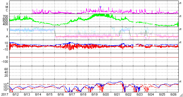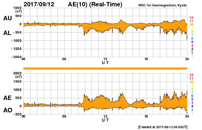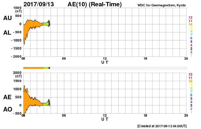 (c) SDO (NASA)、(動画加工 : 宇宙天気ニュース) ![]() 2680黒点群と太陽の向こう側の2673黒点群によるCME。SOHO衛星LASCO C2。 (c) SOHO (ESA & NASA)、 (動画加工 : 宇宙天気ニュース) ![]() 世界時9月12日のAE指数(速報値)。 (c) 京都大学WDC ![]() 世界時9月13日のAE指数(速報値)。 (c) 京都大学WDC ![]() SDO衛星のAIA193カメラによる太陽コロナの様子 (c) SDO (NASA) ![]() SDO衛星による太陽の可視光写真。マウスの矢印を写真に重ねると、黒点番号付きの写真に切り替わります。 (c) SDO (NASA) ![]() DSCOVRが観測した太陽風の磁場(1番上の枠、黒線は全体の強度、赤線は南北成分) および、太陽風の密度(3番目の紫線)、速度(4番目の青線) (c) データ:NOAA/SWPC、作図:宇宙天気ニュース ![]() 27日の太陽周期に合わせたデータプロット 太陽が同じ面を地球に向けていた27日前の変化から、今後を予想することができます。 (c) 作図:宇宙天気ニュース