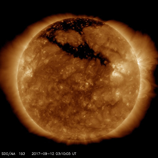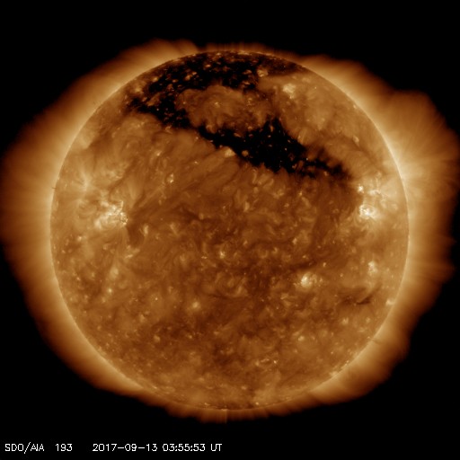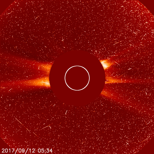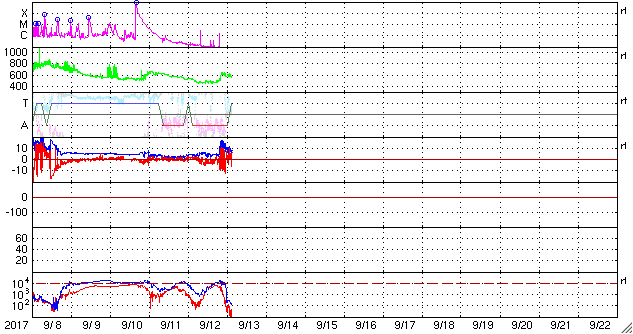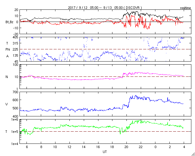 2017/ 9/13 13:07 更新 CMEによる太陽風の乱れが到来し、速度は650km/秒に高まりました。 担当 篠原 11日に太陽の西の端で発生した X8.2大規模フレアの時のCMEによる太陽風の乱れが、 今朝早く、13日4時半(世界時12日19時半)に、 DSCOVR衛星で観測されました。 太陽風の速度は、500km/秒から650km/秒に上昇し、 磁場強度も、5nTから15nTに強まりました。 フレアの発生から2日と4時間での到来です。 太陽の西の端の向こう側に回り込んだ後のフレアでしたので、 CMEによる乱れは、太陽の見えない側にまで大きく広がったと言えます。 このCMEが地球の正面で噴出していたら、 どのような乱れがやって来たのでしょうか。 太陽風磁場の南北成分は、-10nTを超えて南向きに強まりました。 速度が高まっていることもあり、 磁気圏の活動は高まって、 AE指数のグラフは、1000nTに達する大きな変化になっています。 現在の太陽風は、速度は560km/秒、磁場強度は7nTと、 それぞれ下がり始めていて、 CMEの乱れは短い時間で通り過ぎそうです。 続いて、コロナホールによる太陽風の高まりが始まります。 既に、現在の太陽風の高まりに重なっているかもしれません。 その場合、太陽風の速度はこれ以上下がらず、 むしろ、再び上昇に変わる可能性があります。 太陽では、東側の2680黒点群が、 12日16時半(世界時12日7時半)にC3.0、 13日4時半(世界時12日19時半)にC1.6と、 小規模フレアを2回起こしています。 フレアの規模は小さいのですが、 SDO衛星AIA193の動画を見ると、 コロナのガスを吹き飛ばすような変化が見えています。 SOHO衛星LASCO C2では、 2つのCフレアに合わせて、 太陽の左に向かって淡いCMEの噴出が見えています (2つめはかなり淡いです)。 3日後くらいに、太陽風磁場の強まりなどの変化が 地球へやって来るかもしれません。 SOHO衛星LASCO C2の動画では、 13日0時(世界時12日15時)と13日4時(世界時12日19時)に、 太陽の右に向かってCMEの噴出が起きています。 太陽の向こう側に回った2673黒点群で、 活発な活動が続いているようです。 太陽放射線は、低下が続いて、 10MeV以上の粒子を示す赤線は、 100を割るところまで下がりました。 一方、SOHO衛星LASCO C2の画像では、 太陽放射線による「snowstorm」の白いノイズが、 減少しながらもまだ残っています。