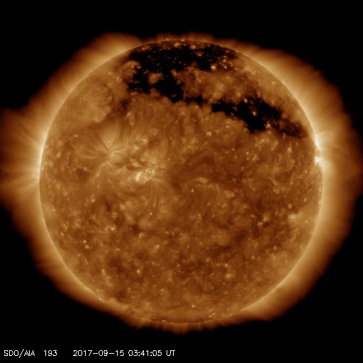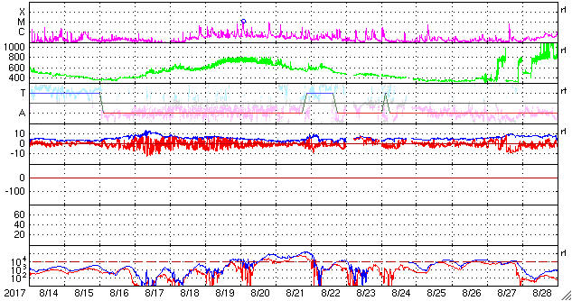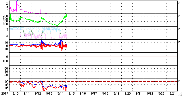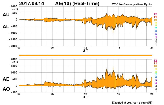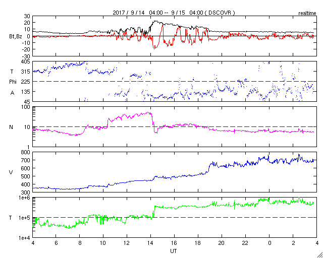2017/ 9/15 12:59 更新 高速太陽風が到来し、磁気圏の活動を強めています。ムルマンスクのオーロラをどうぞ。 担当 篠原 ロシア・ムルマンスクの福島留美さんより、 今期最初のオーロラ写真をいただきました。 ムルマンスク州で今期最初のオーロラが観測されたのは、 8月18日だったそうです。 今日紹介するのは、その直後、8月29日から9月1日にかけて 撮影されたオーロラたちです。 8月31日は、600km/秒の高速太陽風がやって来て、 オーロラの活動を強めた時でした。 実は、この写真は9月2日に送っていただいていたのですが、 私の出張と、2673黒点群の活発な活動のため、 紹介するのが今日になってしまいました。 せっかく速報として送っていただいたのに、申し訳ありませんでした。 ムルマンスクのオーロラ写真家たちによる競演です。 撮影者による味わいの違いがあって、いつも楽しみにしています。 どうもありがとうございます。 コロナホールによる高速の太陽風がやって来ました。 昨夜、14日20時(世界時14日11時)頃から、 太陽風の磁場強度は10nT近くに強まり、 速度も400km/秒から500km/秒へゆっくりと高まりました。 14日23時(世界時14日14時)には、 磁場強度が20nTに強まる大きな変化がやって来て、 速度も500km/秒を超えて更に上昇していきました。 そして、今朝、15日8時(世界時14日23時)には、 速度は700km/秒に達し、以降、かなり高い速度を保っています。 磁場強度は、速度が高まるのと反対に低下に向かい、 現在は5nTと平均的な状態です。 磁場の南北成分は、磁場が強まった頃に、 南北にゆっくりと大きく変化しています。 このため、磁気圏の活動も強まって、 オーロラの活動度を示すAE指数のグラフは、 1000〜1500nTに達する大きな変化を記録しています。 磁場強度が下がり始めると、 南北の変化も振れ幅も小さくなっていきますが、 速度が更に高まっているので、磁気圏の活動な状態は続き、 AE指数は1000nT近い変化を繰り返しています。 極域ではにぎやかなオーロラの活動が見られたのではないでしょうか。 SDO衛星AIA193では、 北半球のコロナホールは東西に広がっていますが、 東側にかけて、次第に緯度が高くなっています。 どこまで地球に影響が及ぶのか、今後の推移に注目してください。 太陽は、2680黒点群が見えるだけで、 目立った活動はなく、穏やかです。 太陽放射線は、減少が続いています。 鹿児島県は、明後日、17日に台風18号の直撃を受けそうな様子です。 このため、今日の夕方から学内LANを停止することになりました。 また、連休明けには、ネットワークの工事も重なっていて、 そのまま21日(木)くらいまでLANは停止する見通しです。 このため、今日の午後から外部サーバーに避難して、 ニュースの更新と公開のみ行います。 フレア速報などのリアルタイムの情報発信は停止します。 また、メールの送受信もできなくなります。 フレアや更新の通知メールは停止します。 また、この間に送っていただいたメールも受信できないままになります。 ご不便をおかけしますが、ご了解下さい。