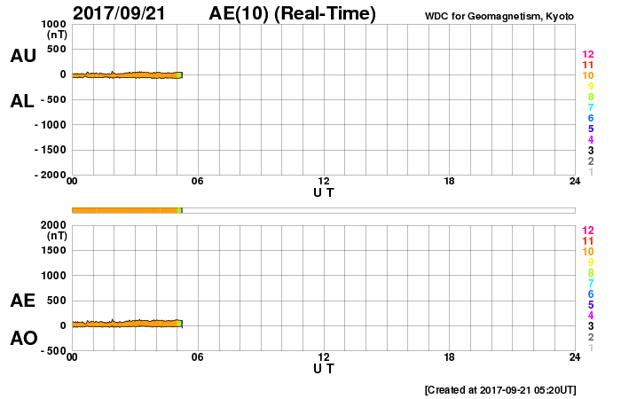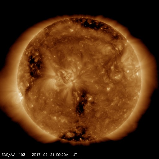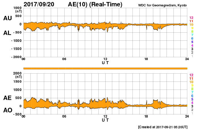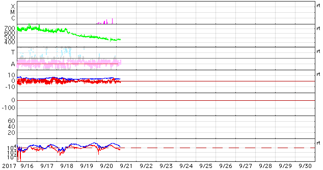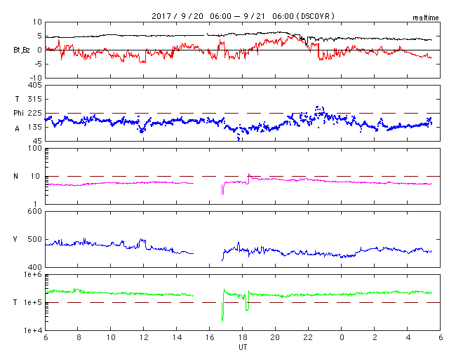 2017/ 9/21 14:34 更新 太陽風の速度はやや高速です。太陽に新しい黒点が現れました。 担当 篠原 昨夜遅く、太陽風の速度は450km/秒まで下がり、 やや高速の風になりました。 以降、現在までこの状態が続いています。 磁場強度は、4〜5nTと平均的な値で安定しています。 南北成分は、小幅ですが、 南を向いたり北を向いたり、ゆっくりと変化しています。 このため、磁気圏の活動も、 高まったり静かになったりしていて、 AE指数では、300〜500nTの小規模の変化が起きたり、 変化がなくなって静かになったりを繰り返しています。 SDO衛星AIA193では、南半球の中央部に、 縦にコロナホールが伸びています。 3日後の太陽風に影響が見られるかもしれません。 また、東端(左端)の赤道域にコロナホールが現れています。 この領域は、前周期の8月31日以降の高速太陽風をもたらしています。 今回も、9月27日頃から同様の変化を起こすかもしれません。 太陽は、東端から黒点が現れ、 2681群と番号が付けられています。 今のところ、Bクラスの小さい変化が起きている程度です。 今後の活動に注目してください。 放射線帯の高エネルギー電子は、 今日は10万には届いていないようですが、 高まった状態が続いています。 ![]() SDO衛星のAIA193カメラによる太陽コロナの様子 (c) SDO (NASA) ![]() SDO衛星による太陽の可視光写真。マウスの矢印を写真に重ねると、黒点番号付きの写真に切り替わります。 (c) SDO (NASA) ![]() DSCOVRが観測した太陽風の磁場(1番上の枠、黒線は全体の強度、赤線は南北成分) および、太陽風の密度(3番目の紫線)、速度(4番目の青線) (c) データ:NOAA/SWPC、作図:宇宙天気ニュース ![]() AE指数(速報値) 下段のAEグラフの値が高くなると、オーロラ活動が活発化しています。 (c) 京都大学WDC ![]() ![]() 27日の太陽周期に合わせたデータプロット 太陽が同じ面を地球に向けていた27日前の変化から、今後を予想することができます。 (c) 作図:宇宙天気ニュース