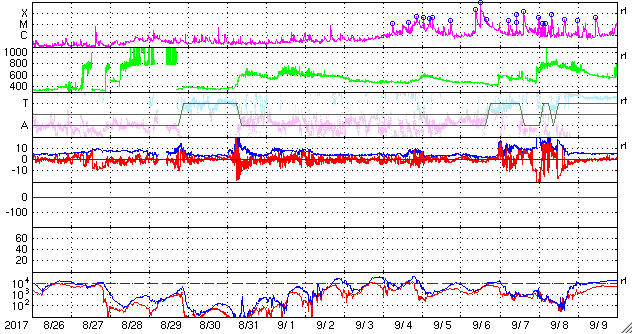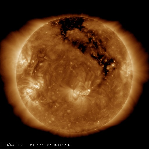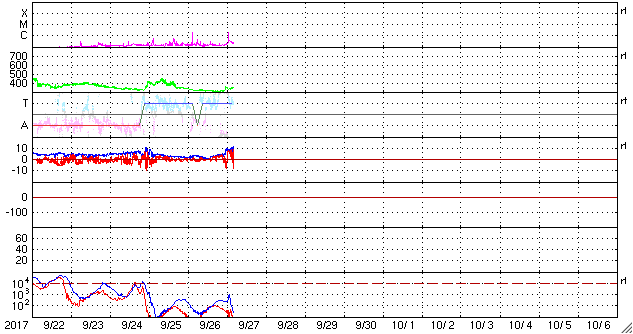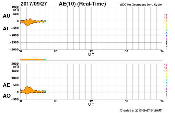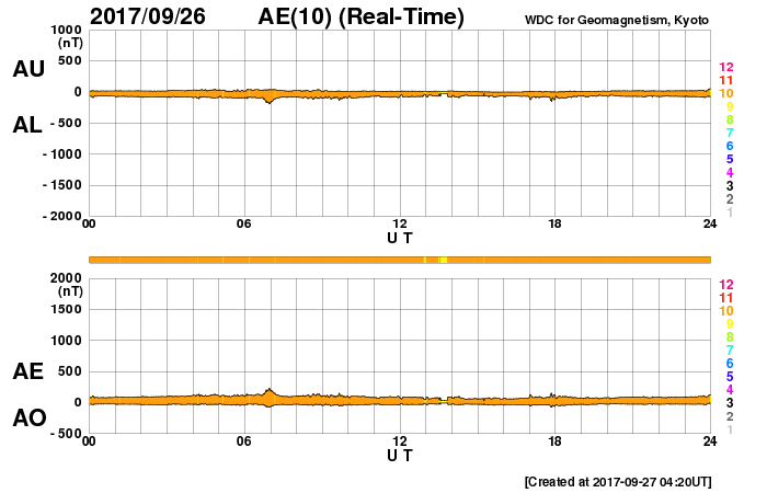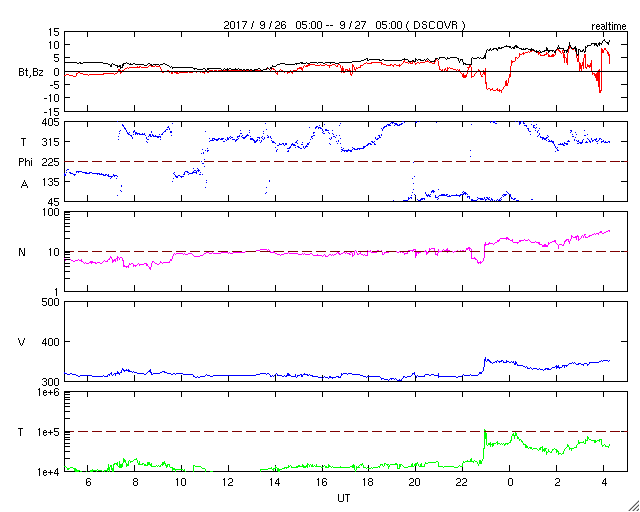 2017/ 9/27 13:26 更新 低速の太陽風が続いています。イエローナイフのオーロラをどうぞ。 担当 篠原 カナダ・イエローナイフで、 現地9月17日から21日にかけて撮影されたオーロラの写真を 景山植光さんよりいただきました。 一昨日のニュースで、14日のオーロラを紹介しましたが、 それに続くオーロラの活動です。 この期間、太陽風は14日から高速風に変わり、 20日頃まで高まった状態が続きました。 太陽風の磁場も南北に良く変化していたため、 AE指数は500nTから1000nT程度の変化が頻繁に発生していました。 景山さんの撮影は、この期間の活動を捉えたものです。 写真の撮影時刻をAE指数のグラフと比べると、 それぞれ500nT前後の高まりのタイミングを捉えています。 この間、好天に恵まれ続けたのも素晴らしいですね。 ダイナミックな写真をありがとうございます。 太陽風は、低速の風が続いています。 今朝、310km/秒から350kmへ少し高まる変化が発生していますが、 以降は安定していて、 まだ高速風の始まりという様子ではありません。 一方、磁場強度は、今朝以降10nTへ強まっています。 この後、速度も本格的に高まり始めるかもしれません。 太陽風の変化に注目して下さい。 磁気圏は概ね静穏です。 太陽風の磁場が強まっているので、 南北成分が南向きに強まると、 磁気圏の活動を高める可能性があります。 今朝も、一時的に-5nTの変化が到来し、 AE指数が500nTに高まる変化が発生しています。 太陽風の速度が高まっていくと、 磁気圏の変化も次第に規模が大きくなるでしょう。 太陽は、東端(左端)の2683黒点群で、 C1.7の小規模フレアが発生しています。 この他に特に活動は見られず、全体としては穏やかです。 ![]() カナダ・イエローナイフで、現地9月17日1時30分(世界時17日7時30分)に撮影されたオーロラ。 (c) 景山植光氏 ![]() カナダ・イエローナイフで、現地9月17日23時45分(世界時18日5時45分)に撮影されたオーロラ。 (c) 景山植光氏 ![]() カナダ・イエローナイフで、現地9月20日1時38分(世界時20日7時38分)に撮影されたオーロラ。 (c) 景山植光氏 ![]() カナダ・イエローナイフで、現地9月21日1時05分(世界時21日7時05分)に撮影されたオーロラ。 (c) 景山植光氏 ![]() SDO衛星のAIA193カメラによる太陽コロナの様子 (c) SDO (NASA) ![]() SDO衛星による太陽の可視光写真。マウスの矢印を写真に重ねると、黒点番号付きの写真に切り替わります。 (c) SDO (NASA) ![]() DSCOVRが観測した太陽風の磁場(1番上の枠、黒線は全体の強度、赤線は南北成分) および、太陽風の密度(3番目の紫線)、速度(4番目の青線) (c) データ:NOAA/SWPC、作図:宇宙天気ニュース ![]() AE指数(速報値) 下段のAEグラフの値が高くなると、オーロラ活動が活発化しています。 (c) 京都大学WDC ![]() ![]() 27日の太陽周期に合わせたデータプロット 太陽が同じ面を地球に向けていた27日前の変化から、今後を予想することができます。 (c) 作図:宇宙天気ニュース