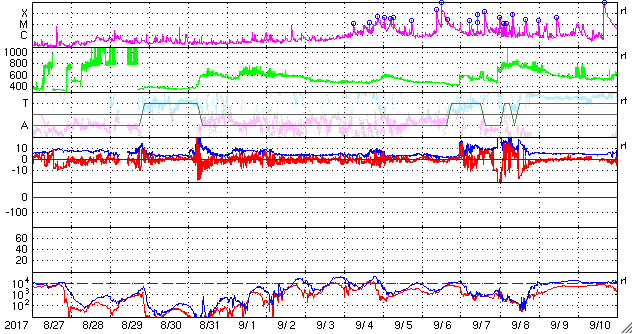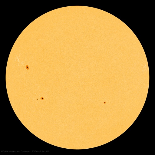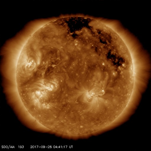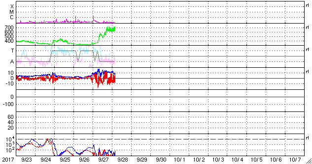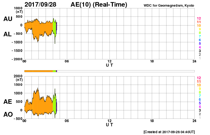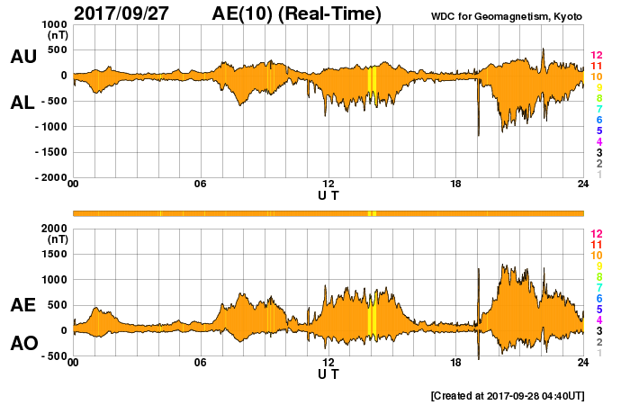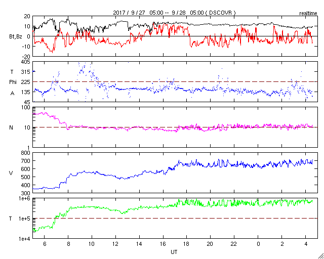 2017/ 9/28 13:47 更新 高速太陽風が到来し、磁気圏の活動も強まっています。イエローナイフのオーロラをどうぞ。 担当 篠原 昨日のニュースの後、太陽風の磁場強度は15nTに強まり、 南北成分も-10nT前後の強い南向きの変化が発生しました。 この影響で磁気圏の活動が高まり、 AE指数では500nTを超える中規模の変化が発生しました。 ちょうどその頃のオーロラの姿を、 昨日紹介した景山植光さんが、カナダ・イエローナイフで捉え、 写真を送って下さいました。 景山さんによると、現地26日23時(世界時27日5時)頃から、 雲の上に赤いオーロラが現れていたそうです。 そして、現地27日1時(世界時27日7時)に雲の切れ目ができて、 それから約20分間素晴らしいオーロラショーになったそうです。 掲載している写真は、数分間隔で撮影されたものです。 最初の写真を見ると、右手の空にペガススの四辺形があり、 左手には、すばる、おうし座、ぎょしゃ座と冬の星達が見えています。 これで撮影されている空の広がりを把握して、 以降は時間とともに展開していくオーロラの輝きをご覧下さい。 オーロラの壁が押し寄せてくる様子が素晴らしいです。 速報の写真をどうもありがとうございます。 この変化の直後、日本時間27日17時(世界時27日8時)には、 太陽風の速度も上昇を始め、550km/秒へ高まりました。 深夜には600km/秒台へ上がり、現在は680km/秒まで高まっています。 磁場強度も依然10nTに強まったままで、 勢い良く高速太陽風が始まっています。 磁場の南北成分は、南向きに頻繁に振れているため、 磁気圏の活動は一段と高まっていて、 AE指数は1000nTを超える大規模な変化が続いています。 極域では活発なオーロラの活動が起きているようです。 引き続き太陽風の変化、オーロラの活動に注目してください。 太陽は、2682黒点群に小さい黒点が増えていますが、 特に活動は見られず、穏やかな状態が続いています。