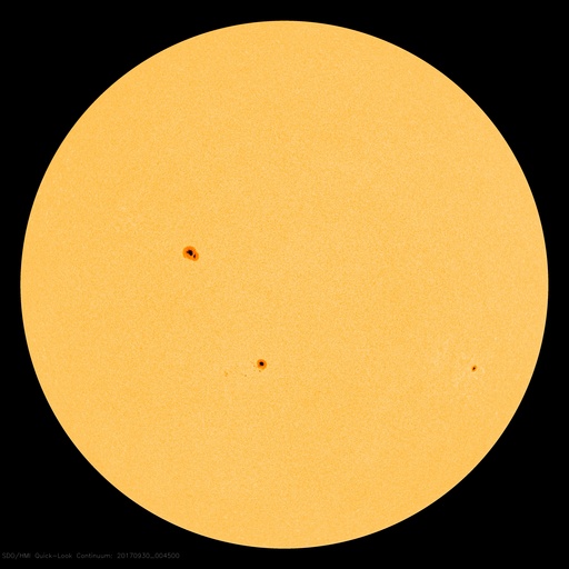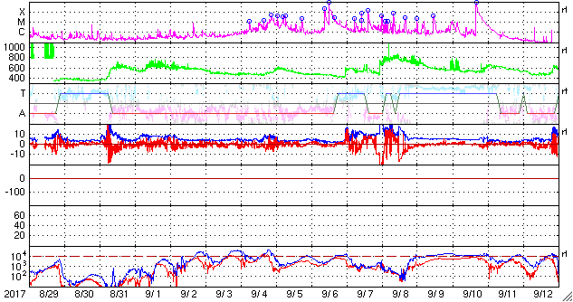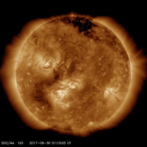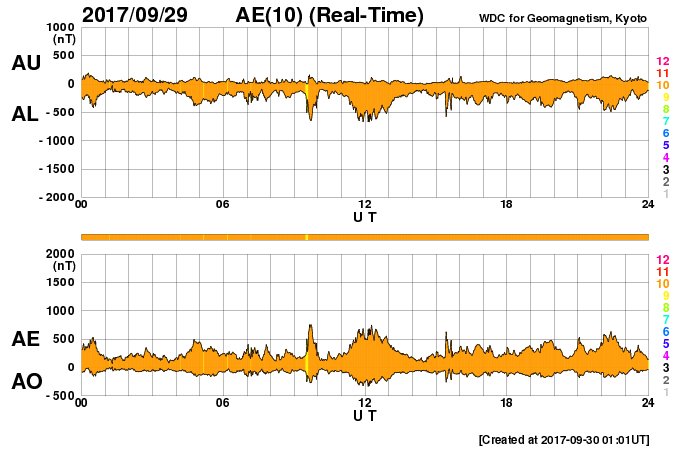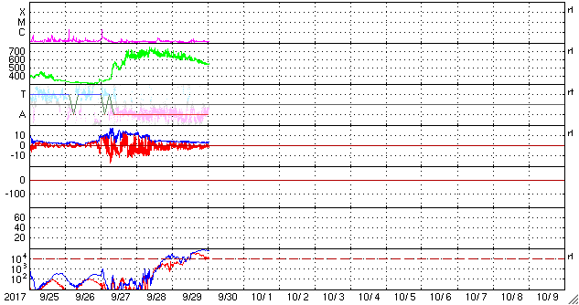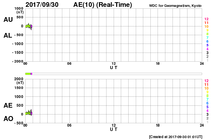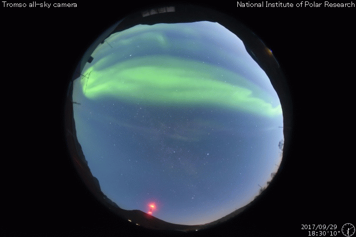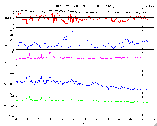 2017/ 9/30 10:17 更新 太陽風の速度は550km/秒に下がり、高速風は終わりに近付いている様です。 担当 篠原 太陽風の速度は、620km/秒から550km/秒へ下がっています。 低下の傾向が続いていますが、高速の状態は保っています。 一方、磁場強度は、4nTから3nTヘ更に下がっています。 高速風の領域としては、後半に入っている様です。 27日前の前周期は、 9月3日以降も500km/秒付近の高めの速度が続いているのですが、 今回はこの後どの様に推移するでしょうか。 太陽風磁場の南北成分は、 南寄りの傾向は続いていますが、 全体の強度が下がってきたため、南向きの変化も小幅になり、 速度の低下と重なって、磁気圏への影響は小さくなっています。 AE指数のグラフは、変化は続いていますが、 大きくても600nT程度の規模になっています。 この後も、変化は更に弱くなっていくでしょう。 世界時29日19時頃のオーロラの活動を、 トロムソの全天カメラの動画で紹介します。 昨日掲載した動画と同じ場所、同じ時間帯で、 活動の雰囲気も似ています。 太陽は、特に活動は見られず、 穏やかな状態が続いています。 前周期に大きなフレアを起こした2682黒点群は、 穏やかなまま、太陽の中心線まで進んでいます。