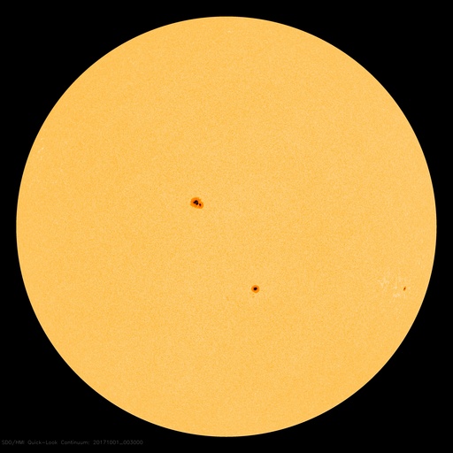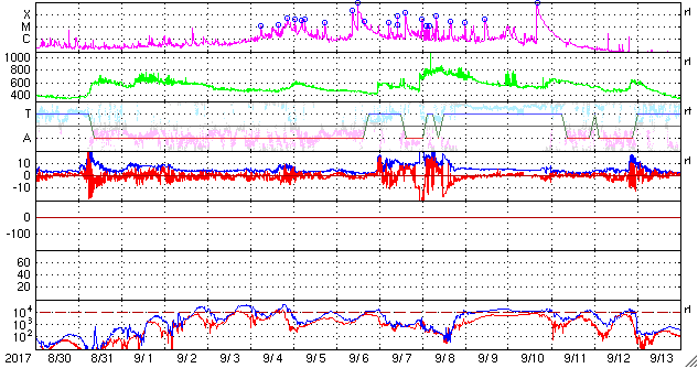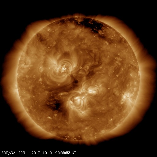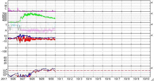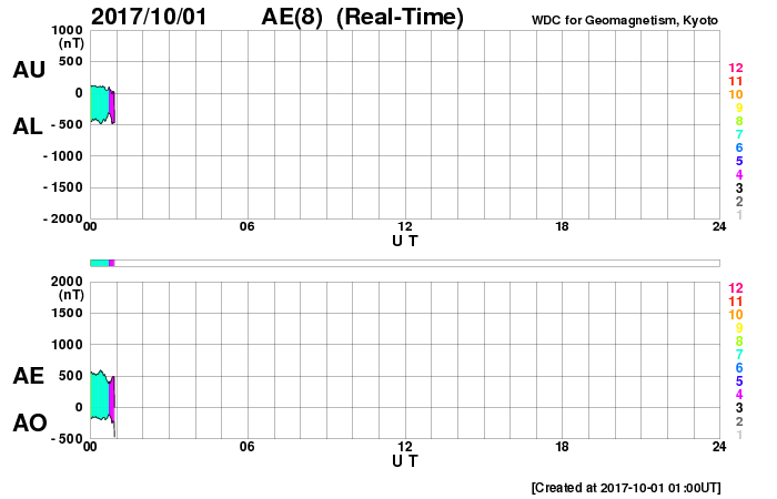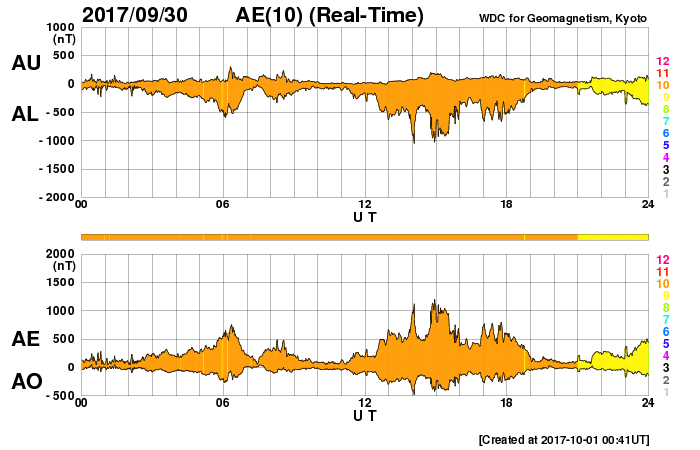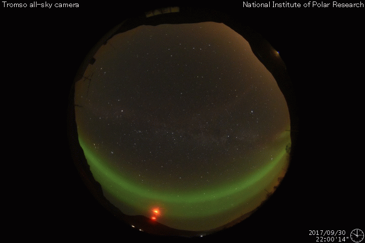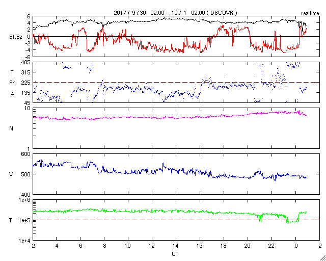 2017/10/ 1 10:02 更新 太陽風の速度は500km/秒を割り、高速風は終わりに近付いています。 担当 篠原 太陽風の速度は、 550km/秒から490km/秒へゆっくりと低下しています。 高速風は終わりに近付いている様です。 このまま下がっていくのか、前周期の様にこの辺りで落ち着くのか、 引き続き注目してください。 磁場強度は、4〜5nTと平均的な値に戻っています。 南北成分は南寄りに振れていて、 -4nT程度の南向きが続いています。 速度はまだ高まっていることもあり、磁気圏の活動は活発に続き、 AE指数は500〜1000nTの変化が起きていて、 昨日のグラフよりも活動は高まっています。 ノルウェー・トロムソでは、 連日、全天カメラで活発なオーロラの撮影が行われています。 世界時30日22〜23時頃のオーロラの様子を紹介します。 AE指数のグラフでは、それほど大きな変化になっていない時間帯ですが、 トロムソの上空では、にぎやかにオーロラが活動していたようです。 太陽風の高まりが落ち着いてきたので、 磁気圏の活動も、今後は次第に穏やかになっていくでしょう。 太陽は、穏やかな状態が続いています。 3つの黒点群も特に変化はありませんが、 先頭の2681群は、次第に太陽の西の端に近付いています。 ![]() ノルウェー・トロムソの全天カメラにより撮影された、世界時30日22時〜23時半のオーロラ。 (c) 国立極地研究所、(動画加工 : 宇宙天気ニュース) ![]() SDO衛星のAIA193カメラによる太陽コロナの様子 (c) SDO (NASA) ![]() SDO衛星による太陽の可視光写真。マウスの矢印を写真に重ねると、黒点番号付きの写真に切り替わります。 (c) SDO (NASA) ![]() DSCOVRが観測した太陽風の磁場(1番上の枠、黒線は全体の強度、赤線は南北成分) および、太陽風の密度(3番目の紫線)、速度(4番目の青線) (c) データ:NOAA/SWPC、作図:宇宙天気ニュース ![]() AE指数(速報値) 下段のAEグラフの値が高くなると、オーロラ活動が活発化しています。 (c) 京都大学WDC ![]() ![]() 27日の太陽周期に合わせたデータプロット 太陽が同じ面を地球に向けていた27日前の変化から、今後を予想することができます。 (c) 作図:宇宙天気ニュース