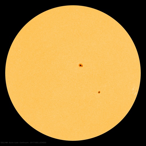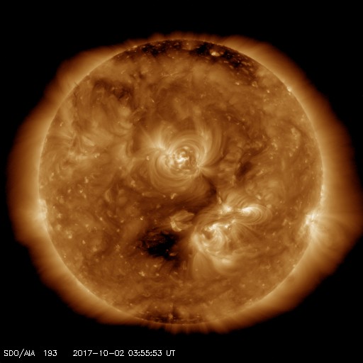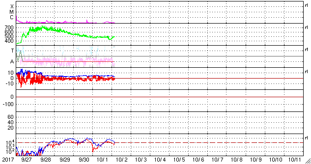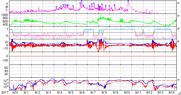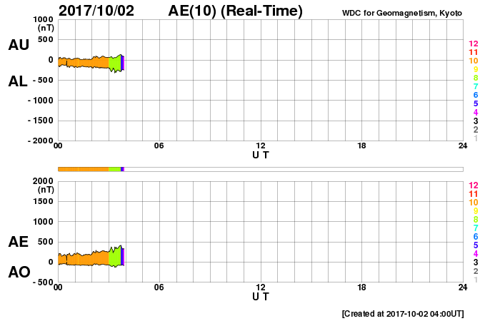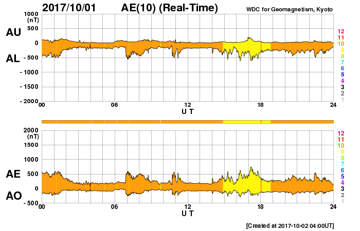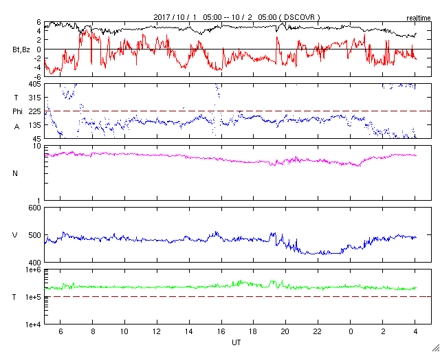 2017/10/ 2 13:11 更新 太陽風は500km/秒近い速度を保っています。磁気圏も比較的活動的です。 担当 篠原 8月21日の皆既日食から1か月半が過ぎてしまいましたが、 やっと今頃になって、撮った写真をいろいろ処理しています。 等間隔で撮っていた太陽の写真を並べて、 欠け始めから終わりまでの動画を作ってみました。 現地8月21日の10時過ぎから13時にかけて、10分間隔の撮影です。 ただし、皆既中の太陽は、10分間隔と関係なく挟んでいます。 こうすると、見えない月が太陽を横切る様子をより実感できる気がします。 また、最後から最初の写真に飛ぶ瞬間、黒点の位置が左に少しずれています。 たった3時間の撮影ですが、太陽の自転による動きが見えているようです。 昨日490km/秒にやや下がっていた太陽風の速度は、 今朝早く、一時的に440km/秒へ下がりましたが、 現在は再び490km/秒に戻っています。 高速の風は続いていて、27日周期の図の前周期の様に、 高まった状態が続いています。 太陽風の磁場強度は、今朝まで4〜5nTを保っていましたが、 現在は3nTに少し下がっています。 南北成分は、南寄りの傾向が続いていて、 AE指数は、変化は500nT前後にやや下がっていますが、 活動的な状態は続いています。 SDO衛星AIA193では、 南半球の中緯度域にコロナホールが見えています。 3日後くらいにこの領域の影響がやって来るかもしれません。 27日周期の図では、前周期の9月7日、8日頃は、 CMEによる突発性の擾乱が到来していたため、 今後の推測の資料に使えません。 太陽は、特に活動はなく穏やかです。 2681黒点群が西の端に沈もうとしています。 ![]() 8月21日にアイダホ州で撮影した皆既日食の10分間隔の動画。皆既中の写真は10分間隔から外れている。 (c) 篠原 学 ![]() SDO衛星のAIA193カメラによる太陽コロナの様子 (c) SDO (NASA) ![]() SDO衛星による太陽の可視光写真。マウスの矢印を写真に重ねると、黒点番号付きの写真に切り替わります。 (c) SDO (NASA) ![]() DSCOVRが観測した太陽風の磁場(1番上の枠、黒線は全体の強度、赤線は南北成分) および、太陽風の密度(3番目の紫線)、速度(4番目の青線) (c) データ:NOAA/SWPC、作図:宇宙天気ニュース ![]() AE指数(速報値) 下段のAEグラフの値が高くなると、オーロラ活動が活発化しています。 (c) 京都大学WDC ![]() ![]() 27日の太陽周期に合わせたデータプロット 太陽が同じ面を地球に向けていた27日前の変化から、今後を予想することができます。 (c) 作図:宇宙天気ニュース